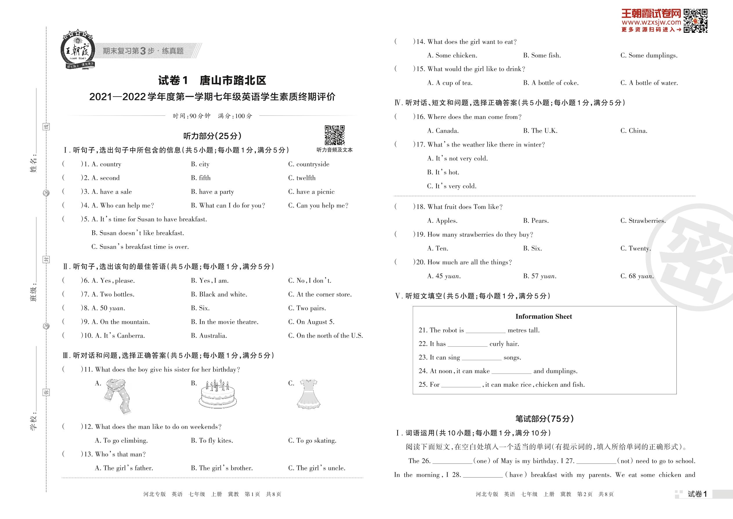 唐山市路北区2021—2022学年度第一学期七年级英语学生素质终期评价(冀教版)【1】