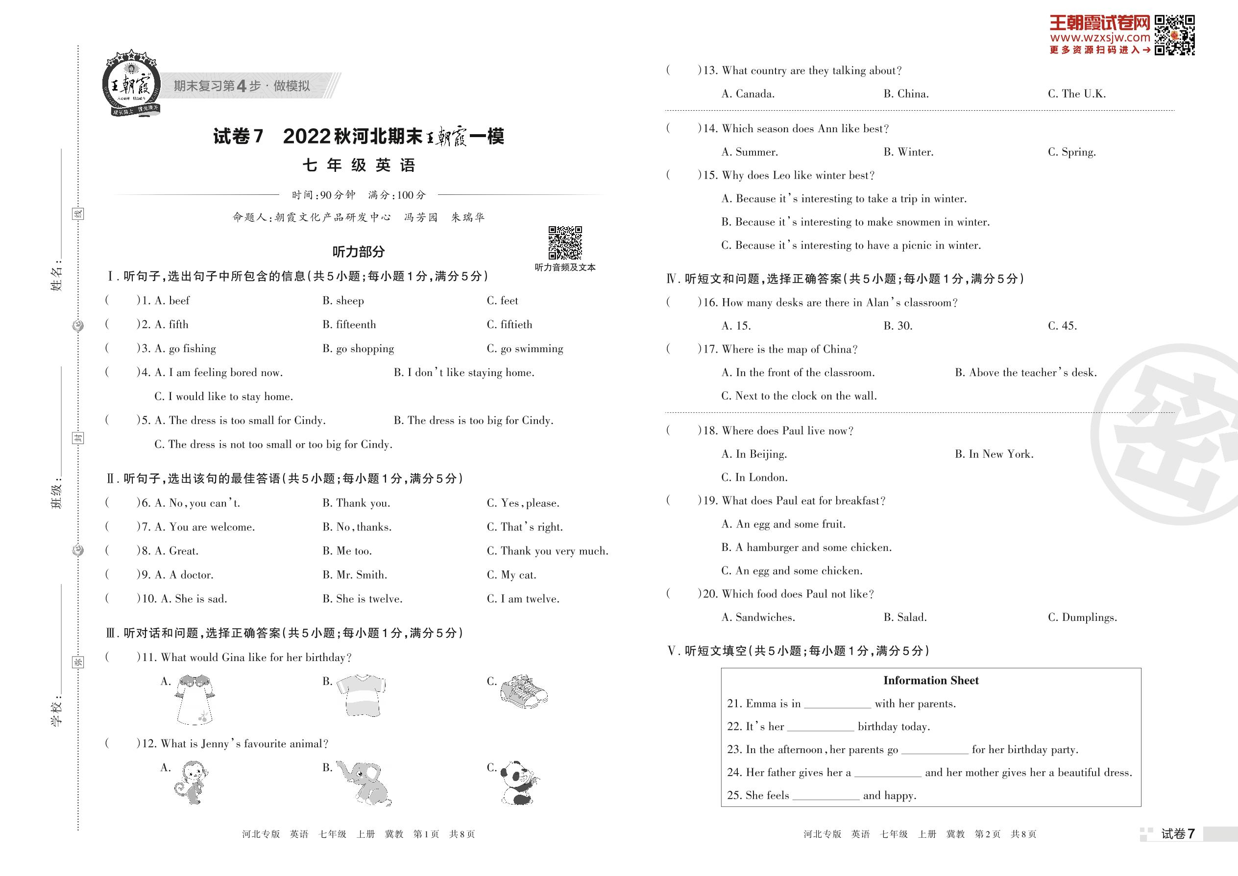 王朝霞期末模拟卷七年级上册英语(冀教版)【7】