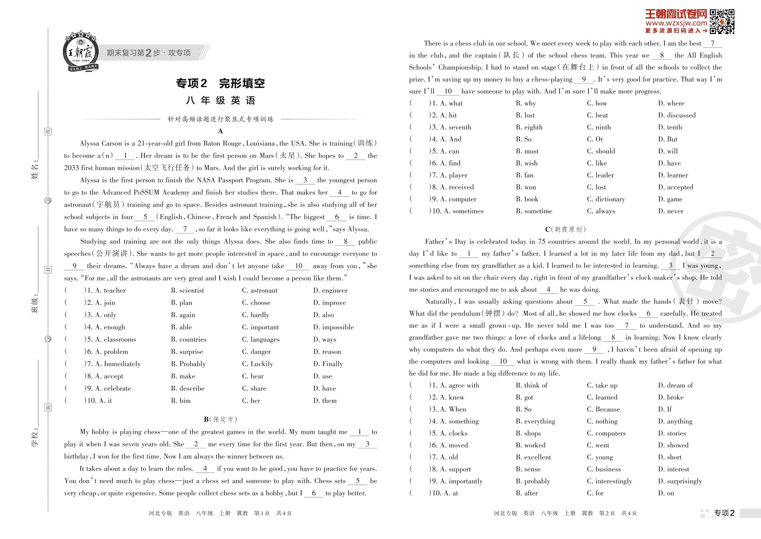 王朝霞期末专项卷——完形填空八年级上册英语(冀教版)【2】