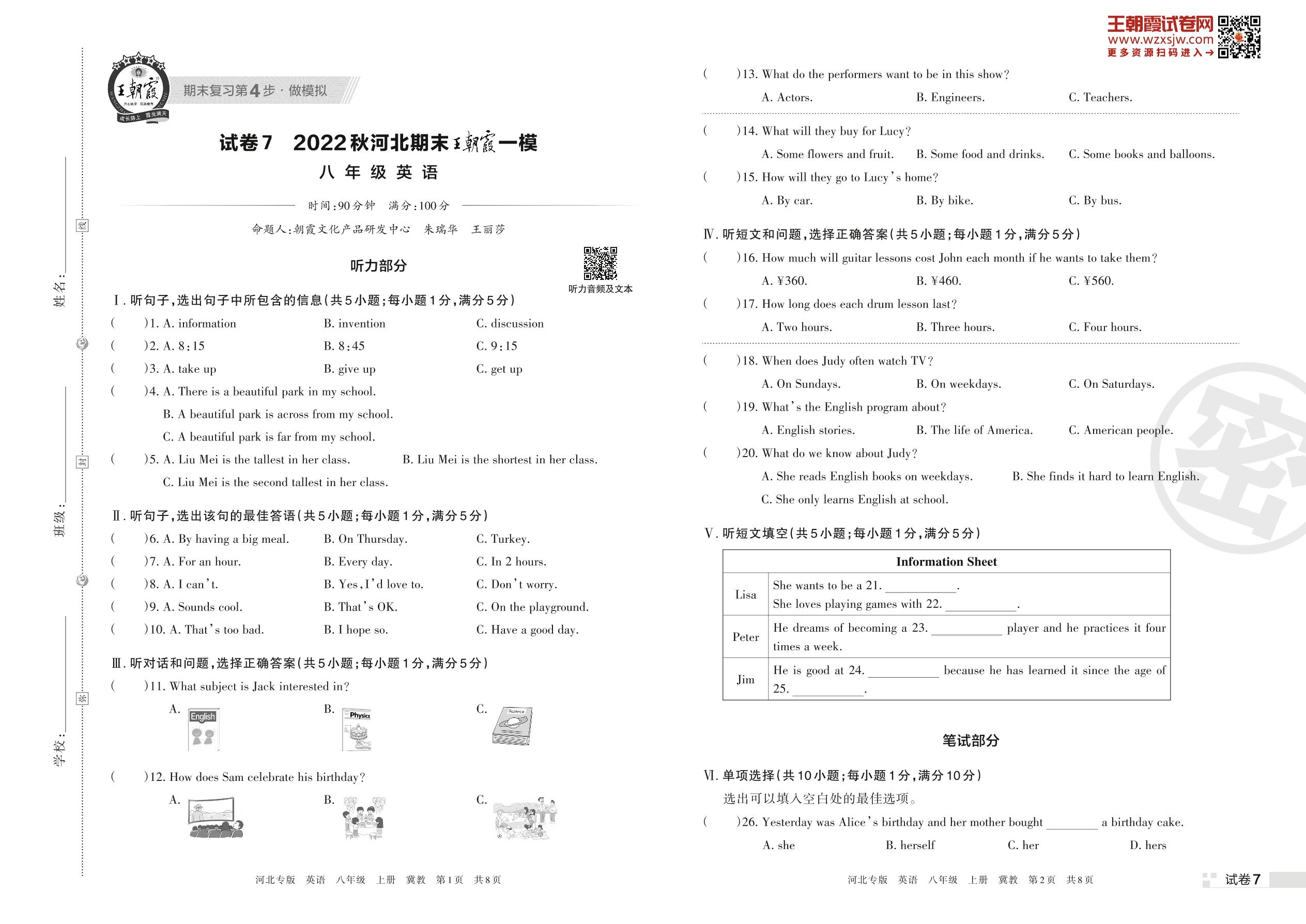 王朝霞期末模拟卷八年级上册英语(冀教版)【7】
