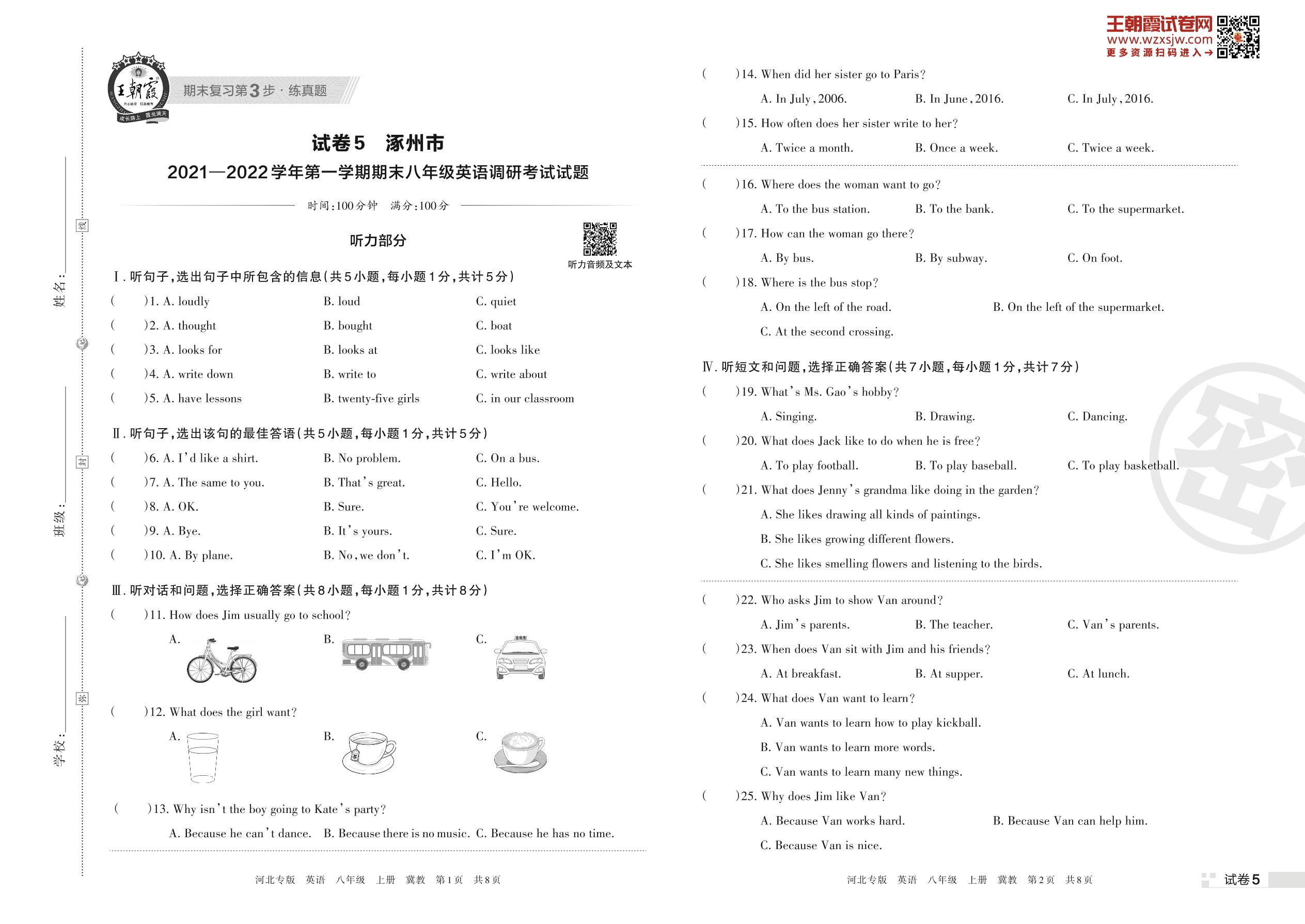 涿州市2021—2022学年第一学期期末八年级英语调研考试试题(冀教版)【5】