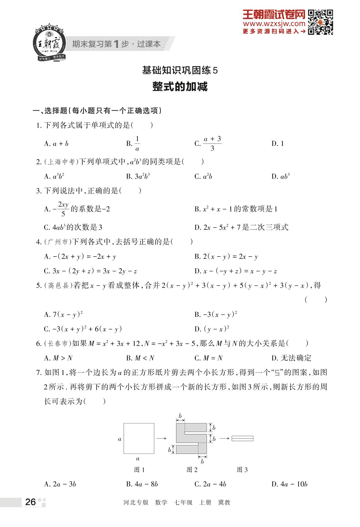 王朝霞期末过课本——基础知识巩固练5 整式的加减七年级上册数学(冀教版)