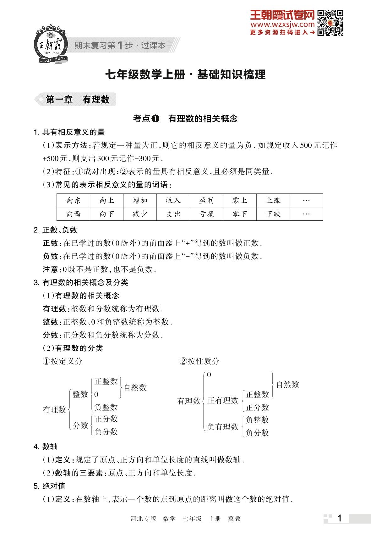 王朝霞期末知识梳理——第一章 有理数七年级上册数学(冀教版)