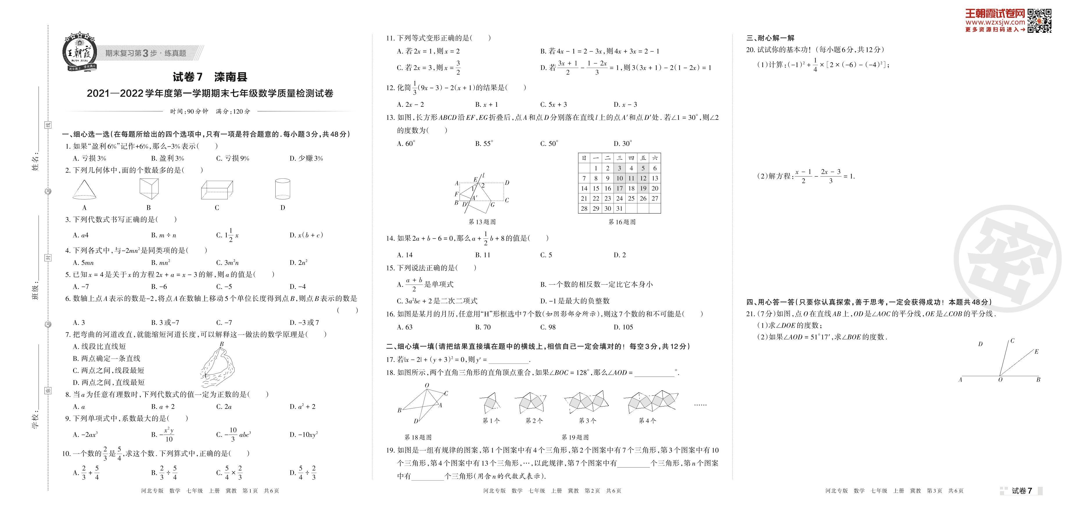 滦南县2021—2022学年度第一学期期末七年级数学质量检测试卷(冀教版)【7】