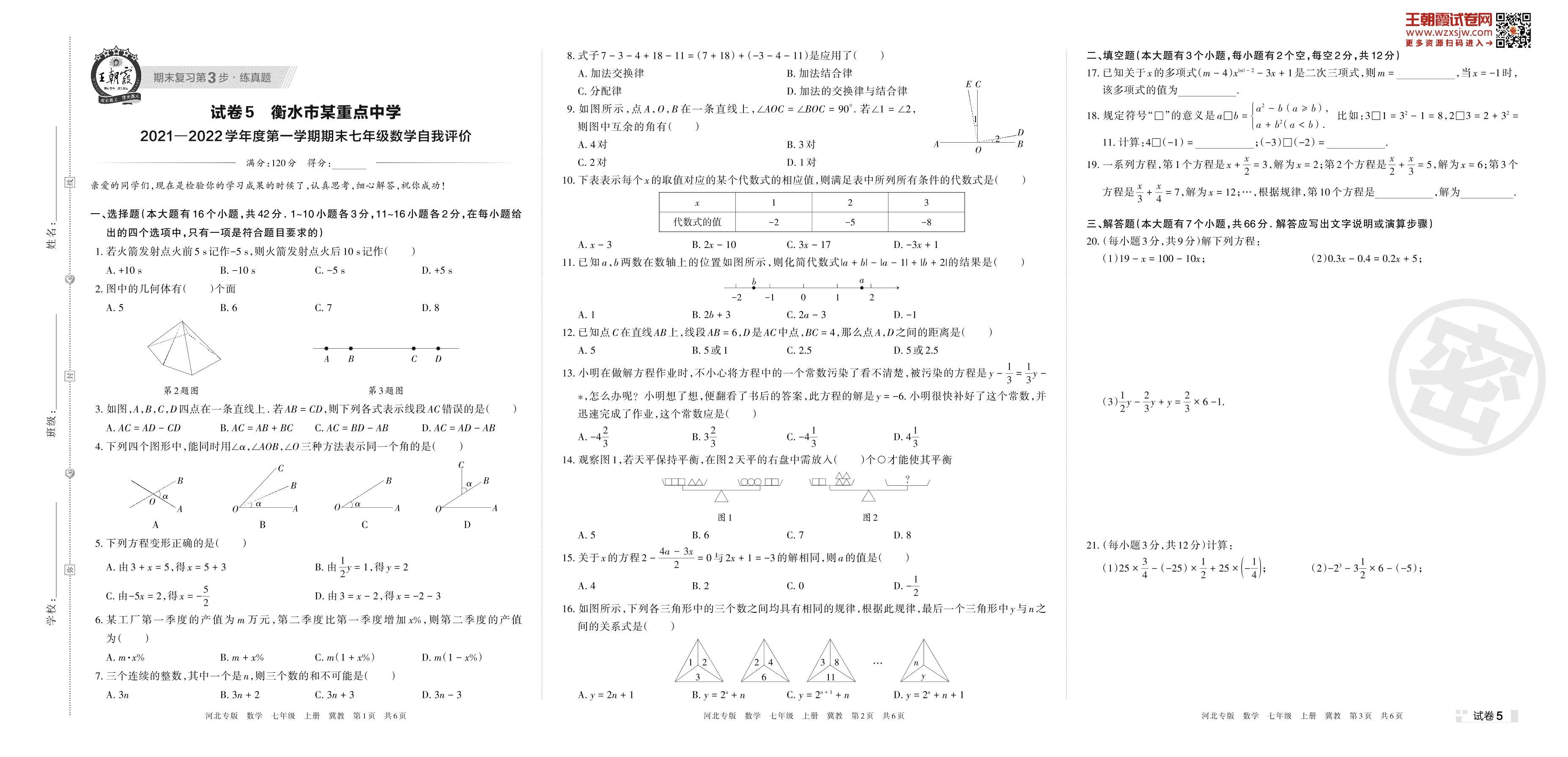 衡水市某重点中学2021—2022学年度第一学期期末七年级数学自我评价(冀教版)【5】