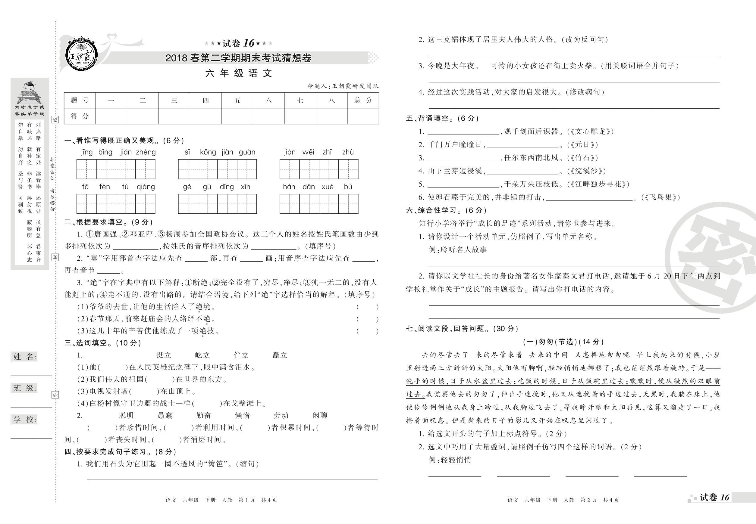 王朝霞期末猜想卷六年级下册语文(人教版)【16】