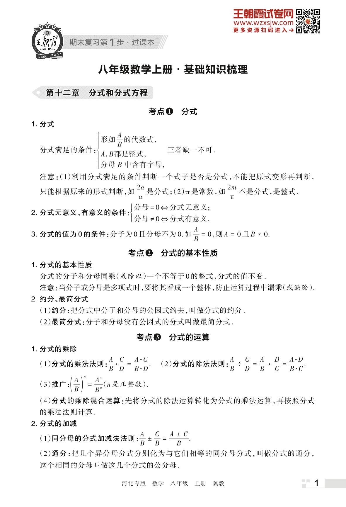 王朝霞期末知识梳理——第十二章 分式和分式方程八年级上册数学(冀教版)