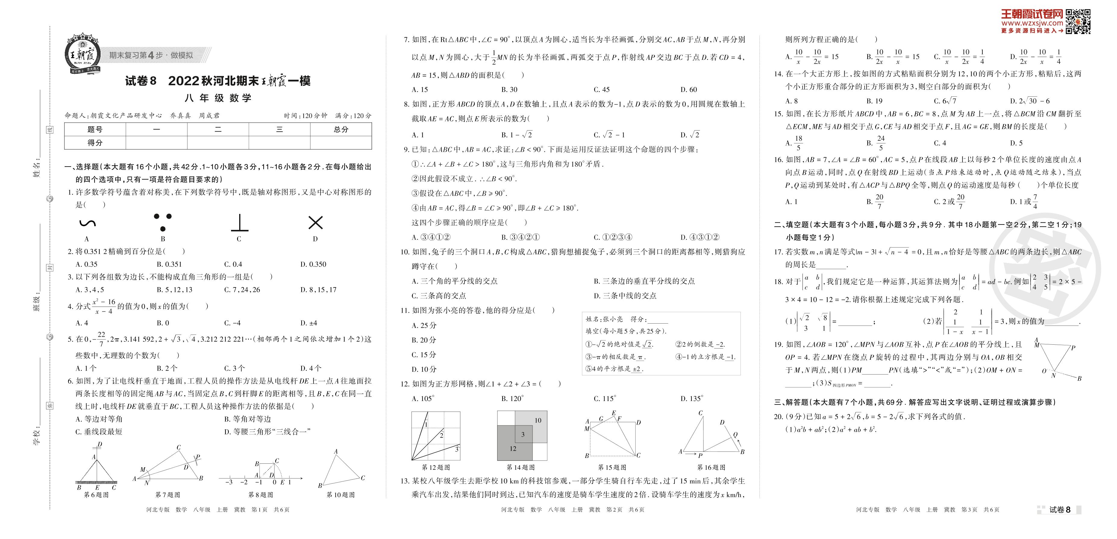王朝霞期末模拟卷八年级上册数学(冀教版)【8】