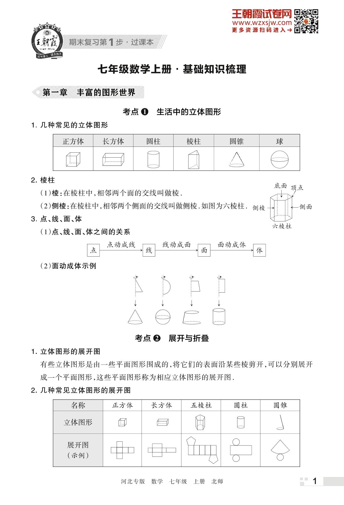 王朝霞期末知识梳理——第一章 丰富的图形世界七年级上册数学(北师版)