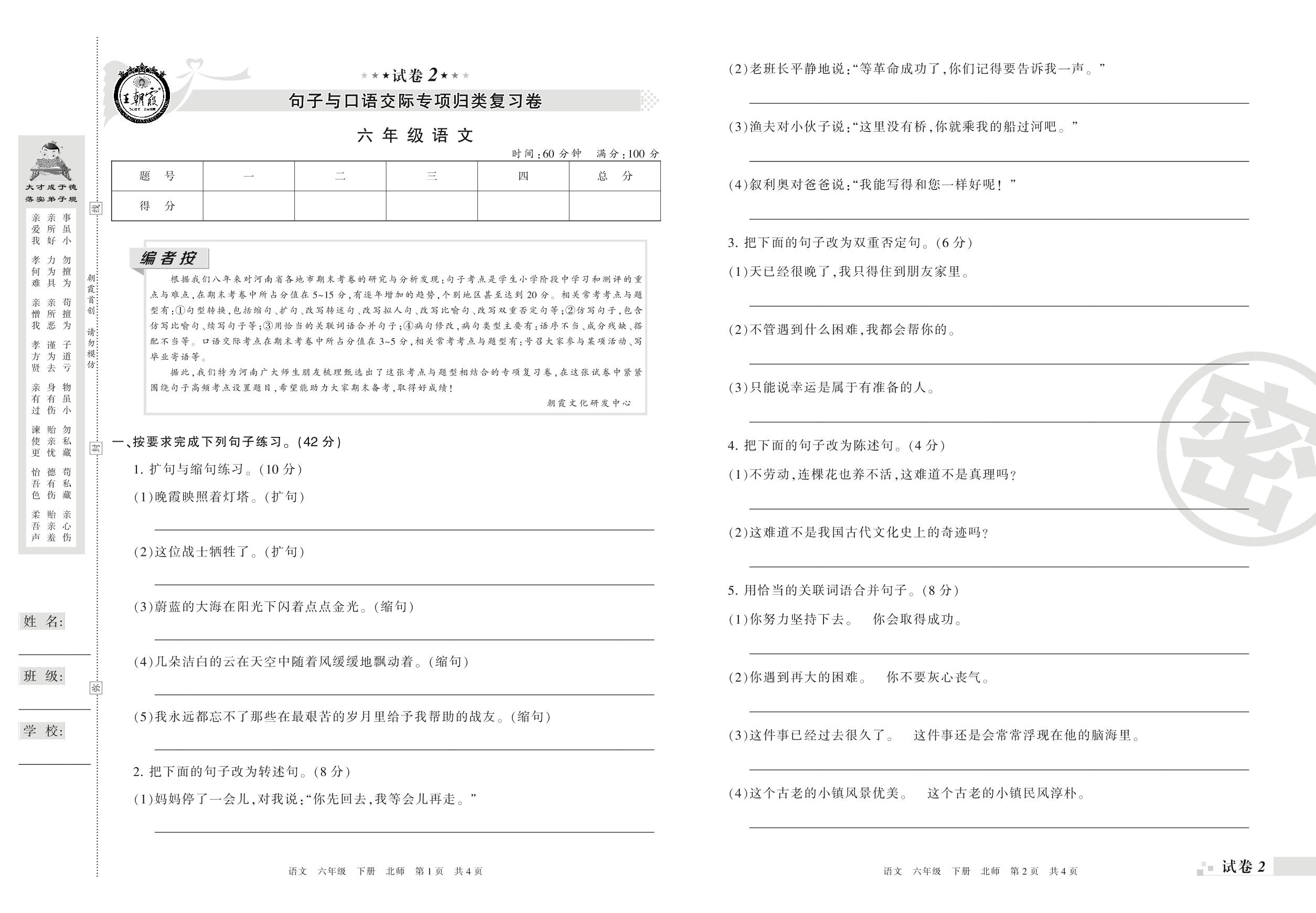 王朝霞期末专项卷——句子与口语交际专项归类复习卷六年级下册语文(北师版)_R210802120449【2】