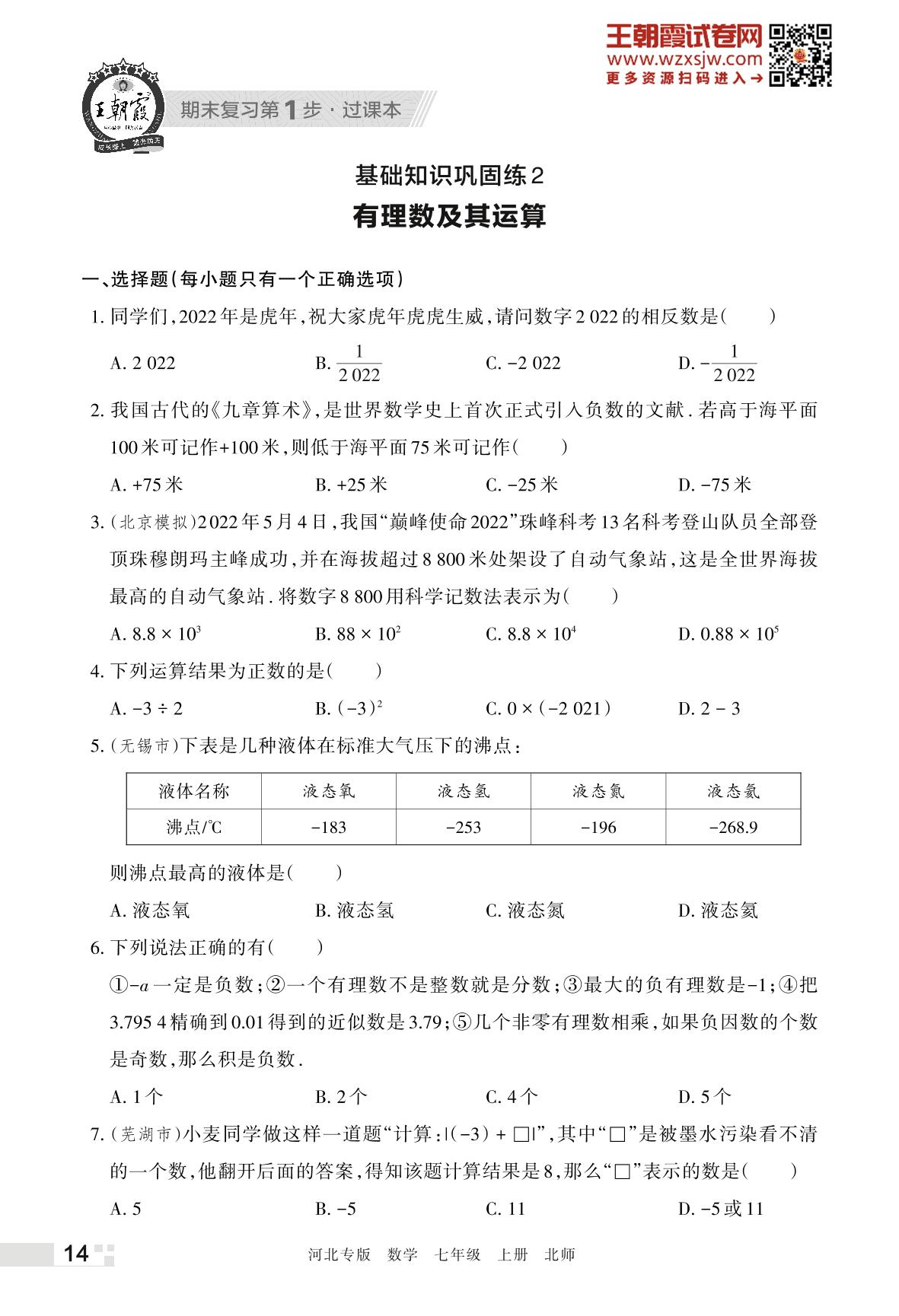 王朝霞期末过课本——基础知识巩固练2 有理数及其运算七年级上册数学(北师版)