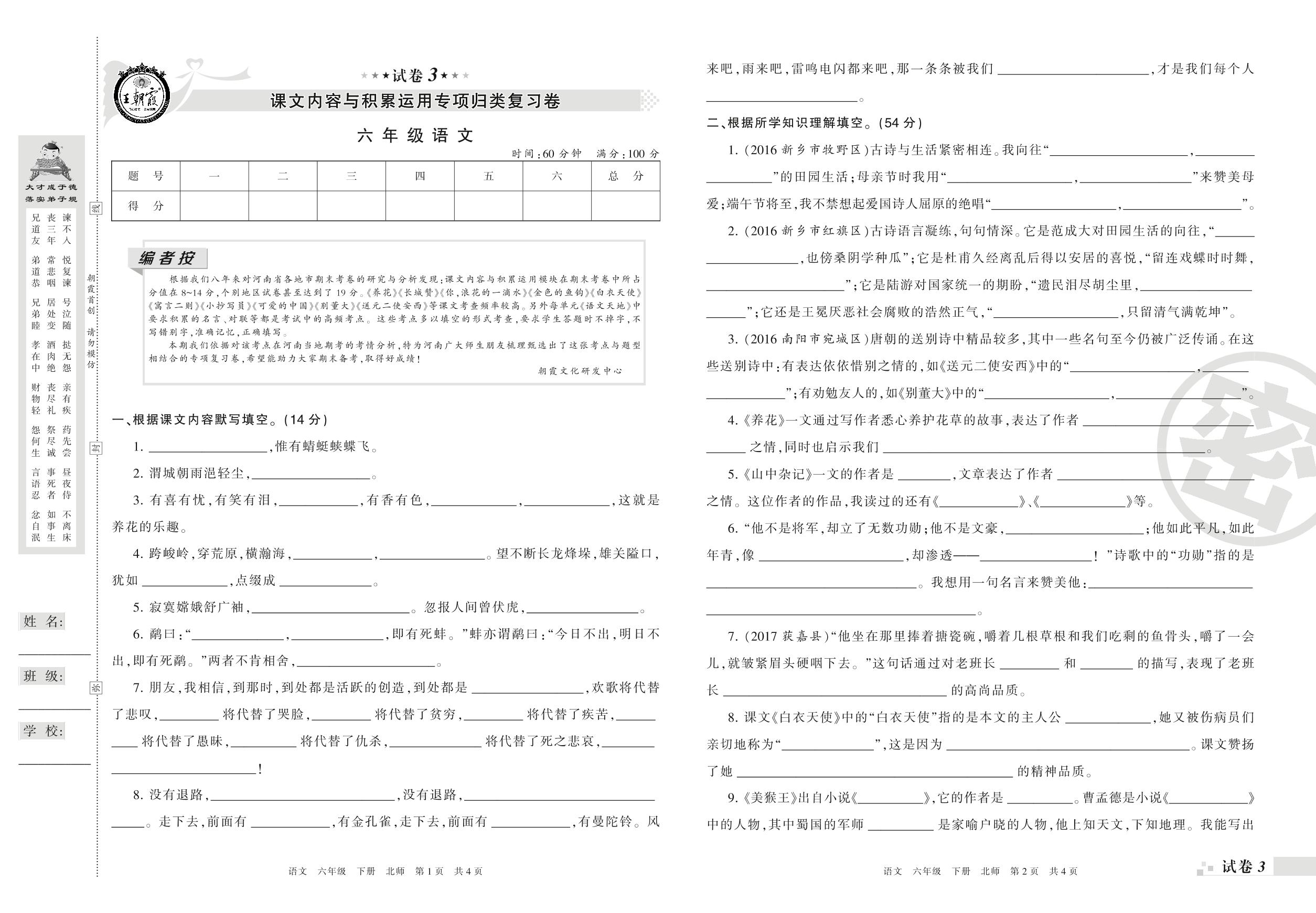 王朝霞期末专项卷——课文内容与积累运用专项归类复习卷六年级下册语文(北师版)_R210802120451【3】