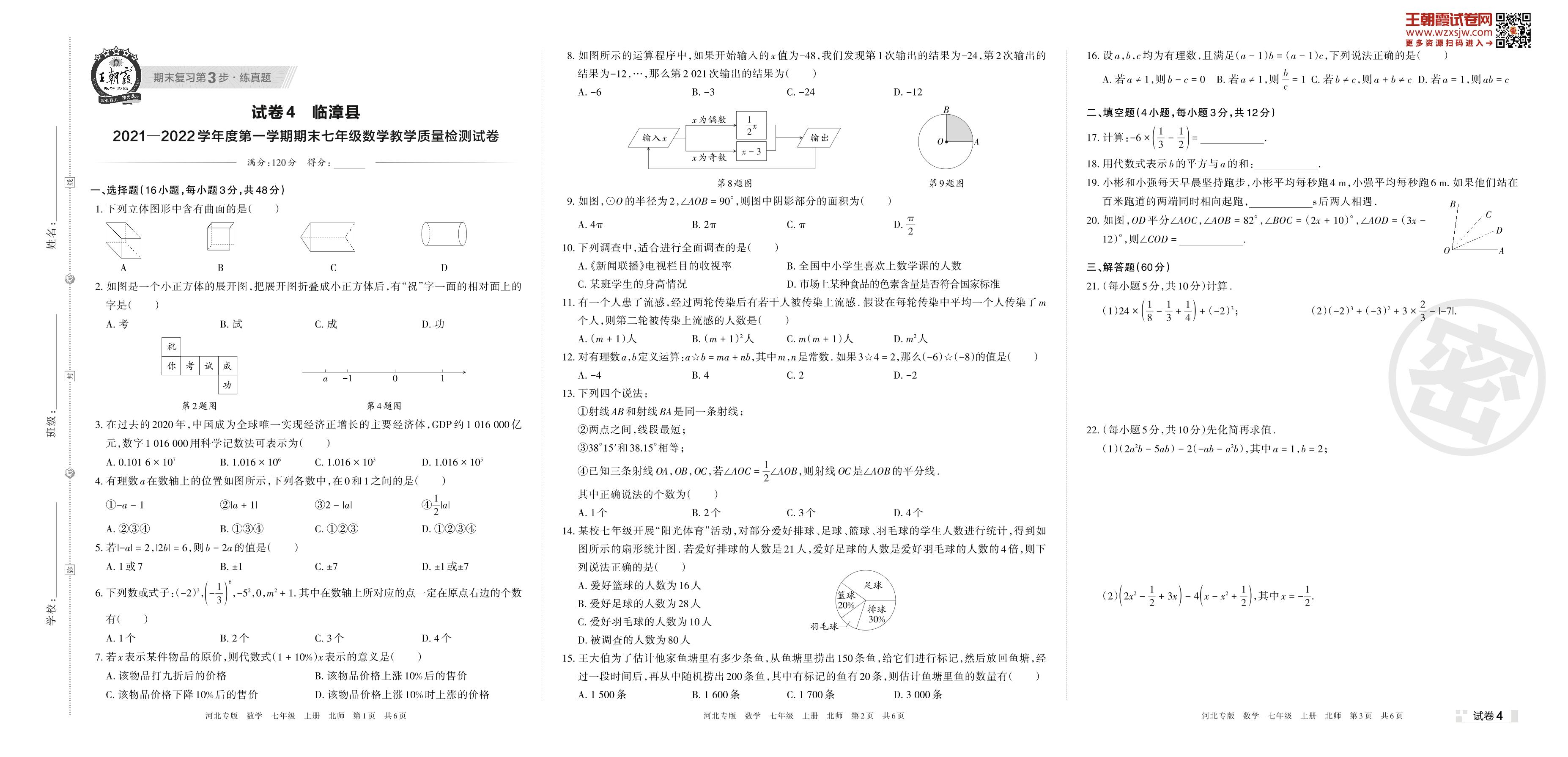 临漳县2021—2022学年度第一学期期末七年级数学教学质量检测试卷(北师版)【4】