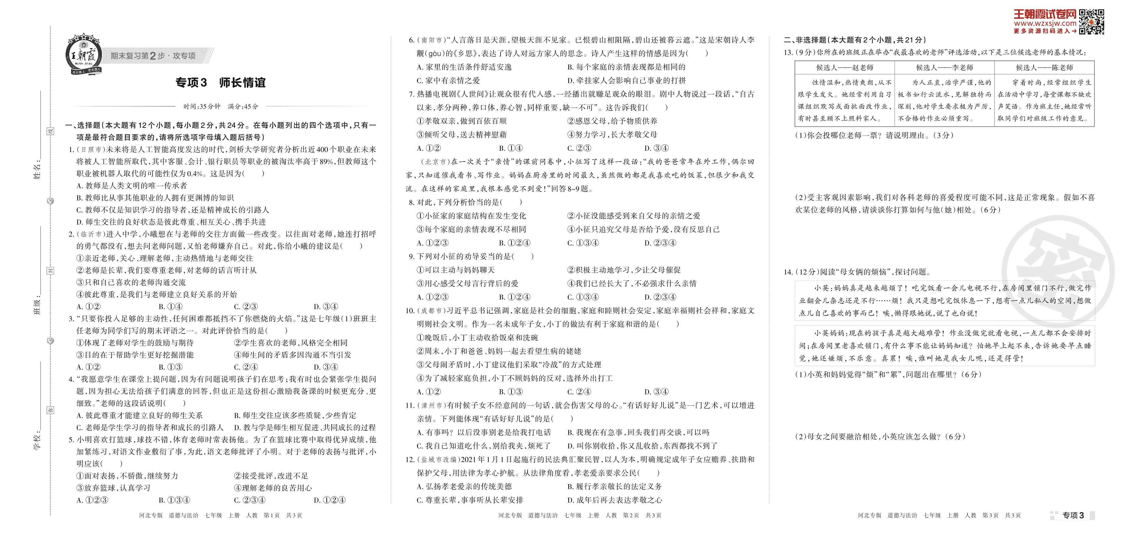 王朝霞期末专项卷——师长情谊七年级上册道德与法治(人教版)_R221124173838164【3】