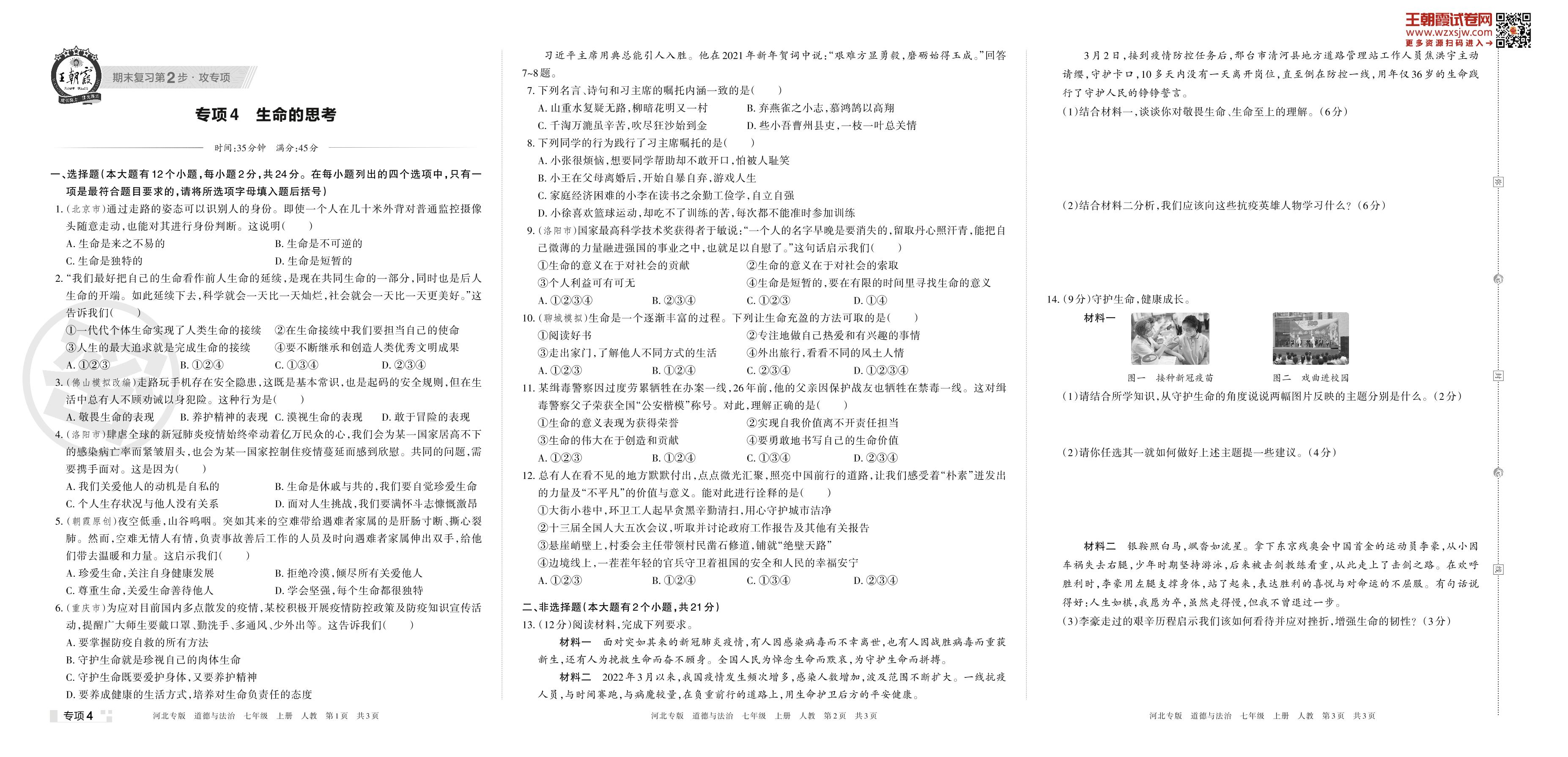 王朝霞期末专项卷——生命的思考七年级上册道德与法治(人教版)_R221124173839856【4】