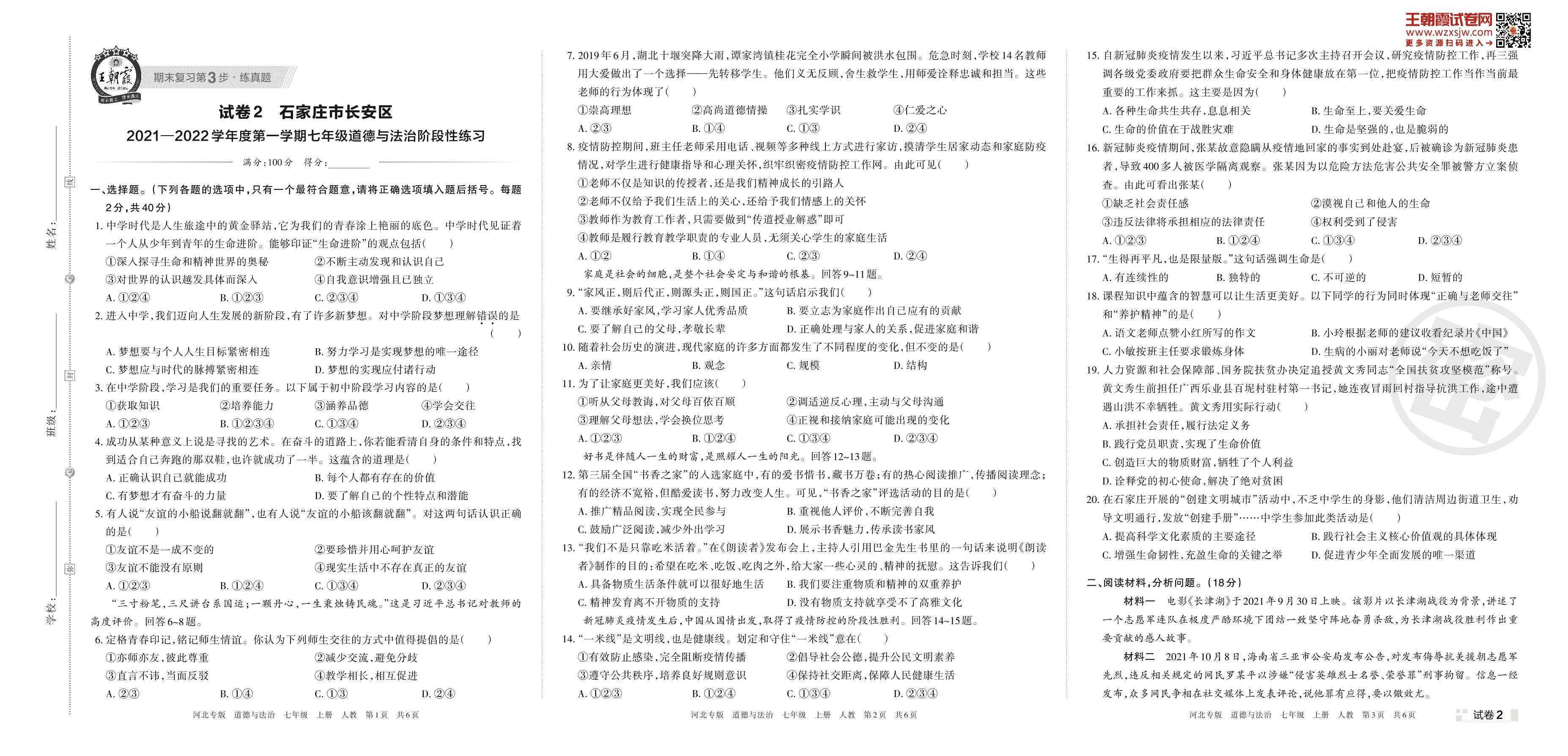 石家庄市长安区2021—2022学年度第一学期七年级道德与法治阶段性练习(人教版)【2】
