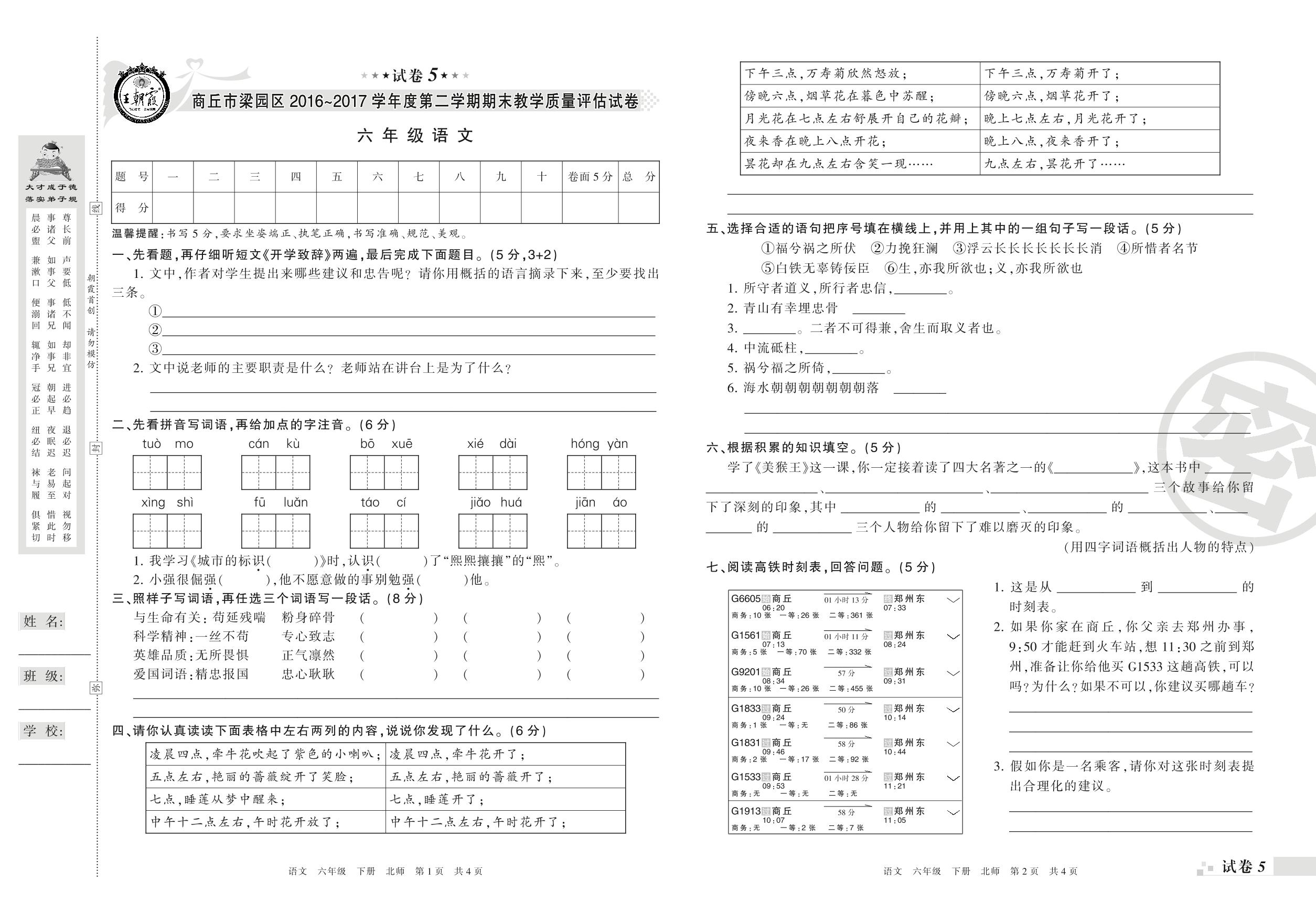 2016-2017学年第二学期商丘市梁园区六年级语文试卷(北师版)【5】