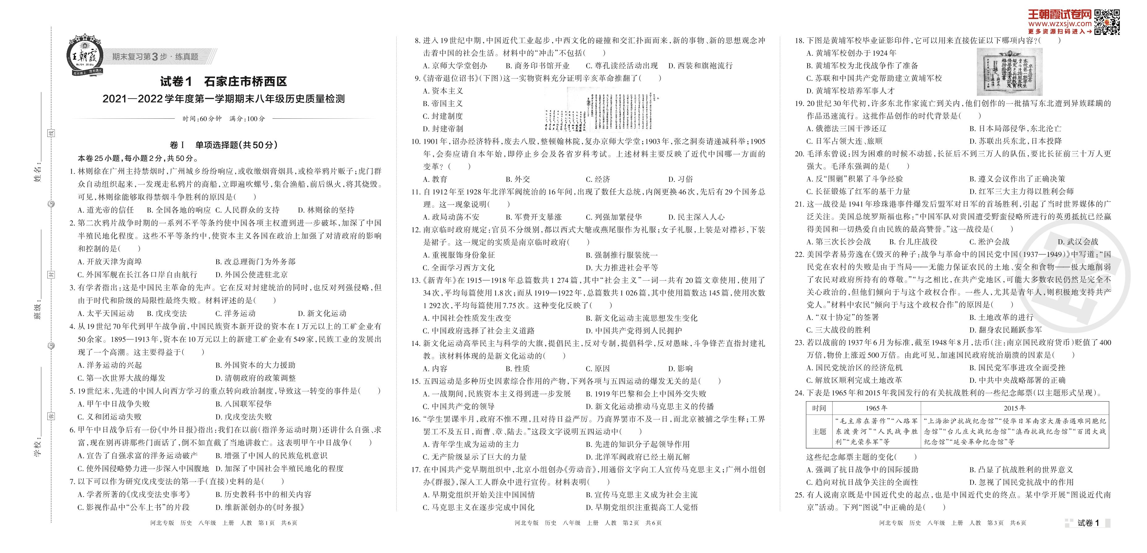 石家庄市桥西区2021—2022学年度第一学期期末八年级历史质量检测(人教版)【1】