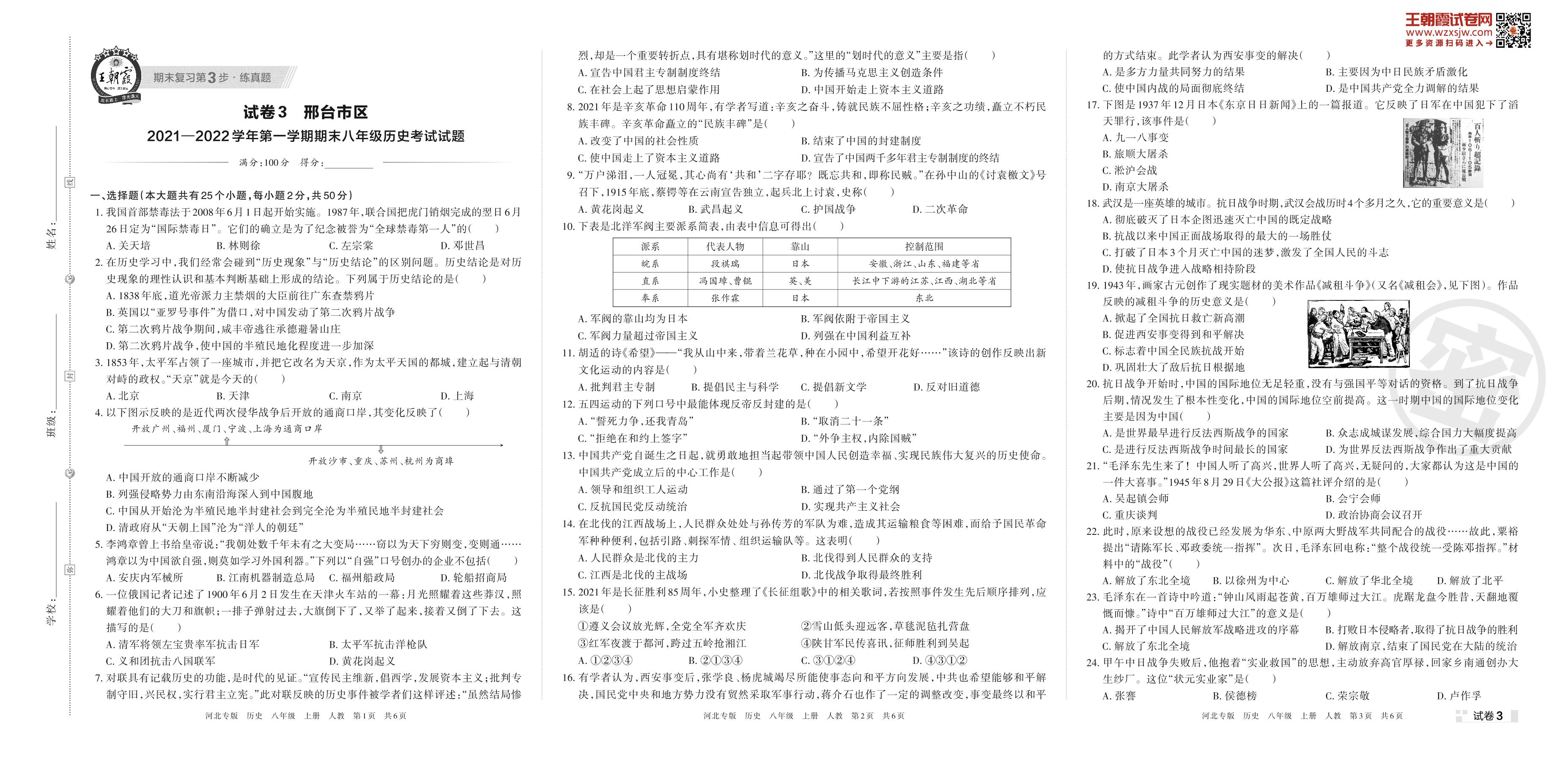 邢台市区2021—2022学年第一学期期末八年级历史考试试题(人教版)【3】