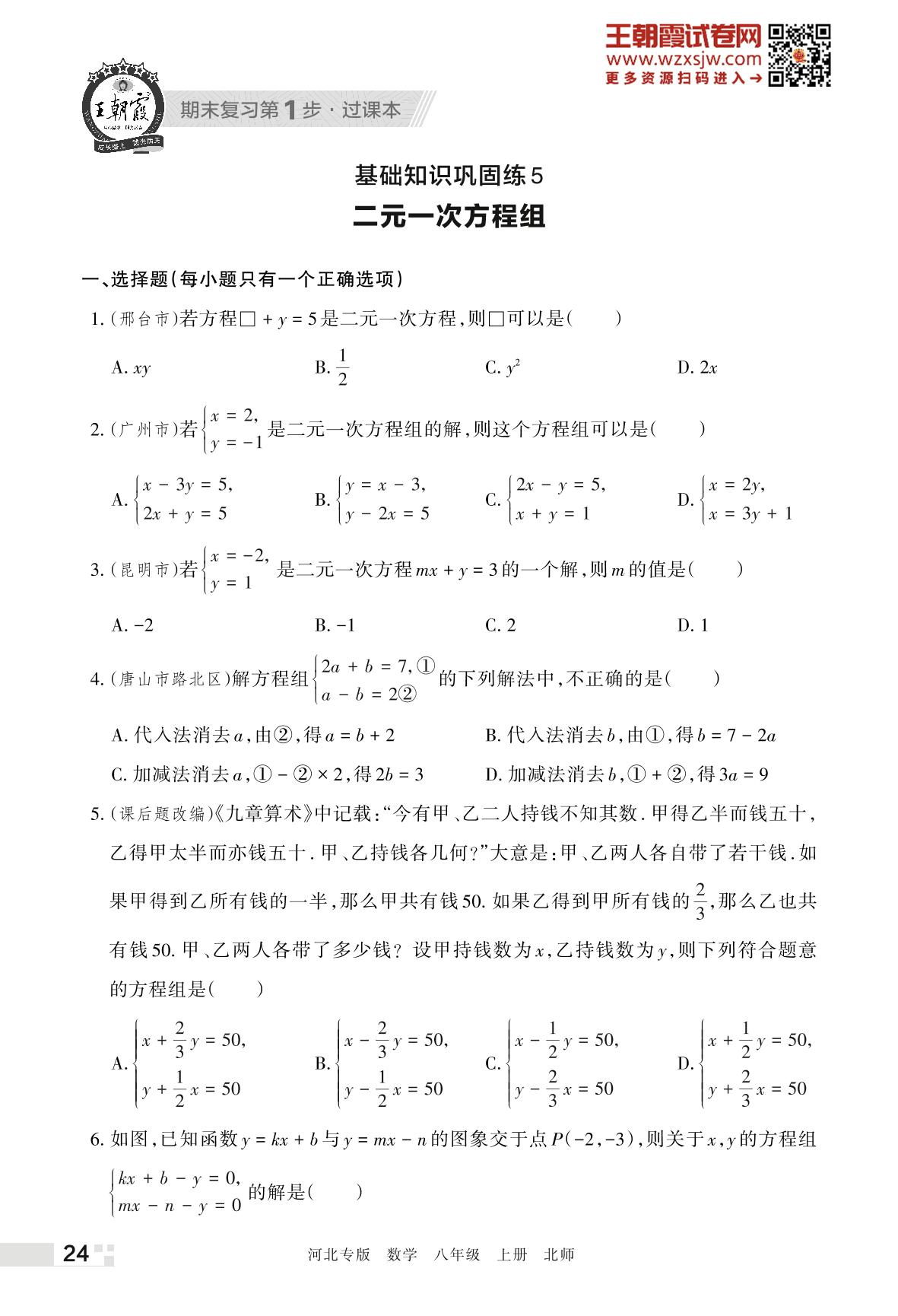 王朝霞期末过课本——基础知识巩固练5 二元一次方程组八年级上册数学(北师版)