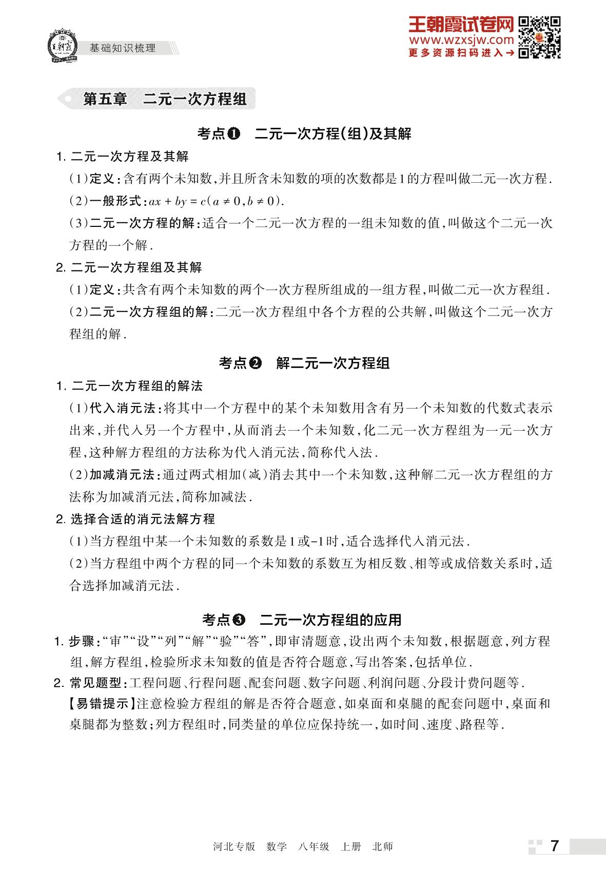 王朝霞期末知识梳理——第五章 二元一次方程组八年级上册数学(北师版)