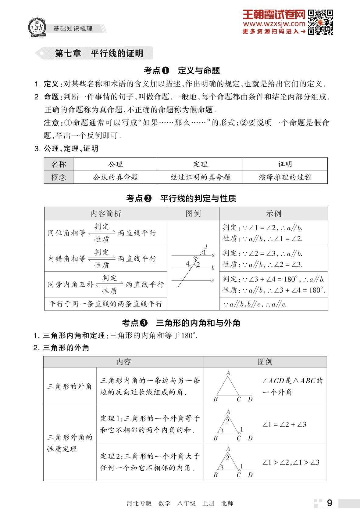 王朝霞期末知识梳理——第七章 平行线的证明八年级上册数学(北师版)