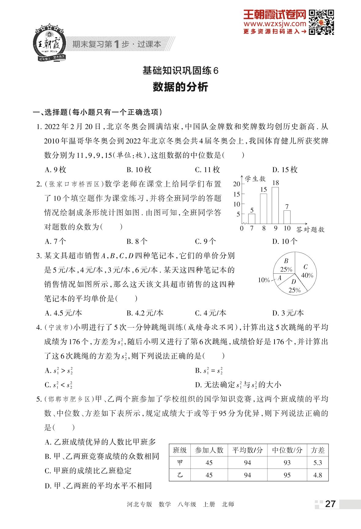 王朝霞期末过课本——基础知识巩固练6 数据的分析八年级上册数学(北师版)
