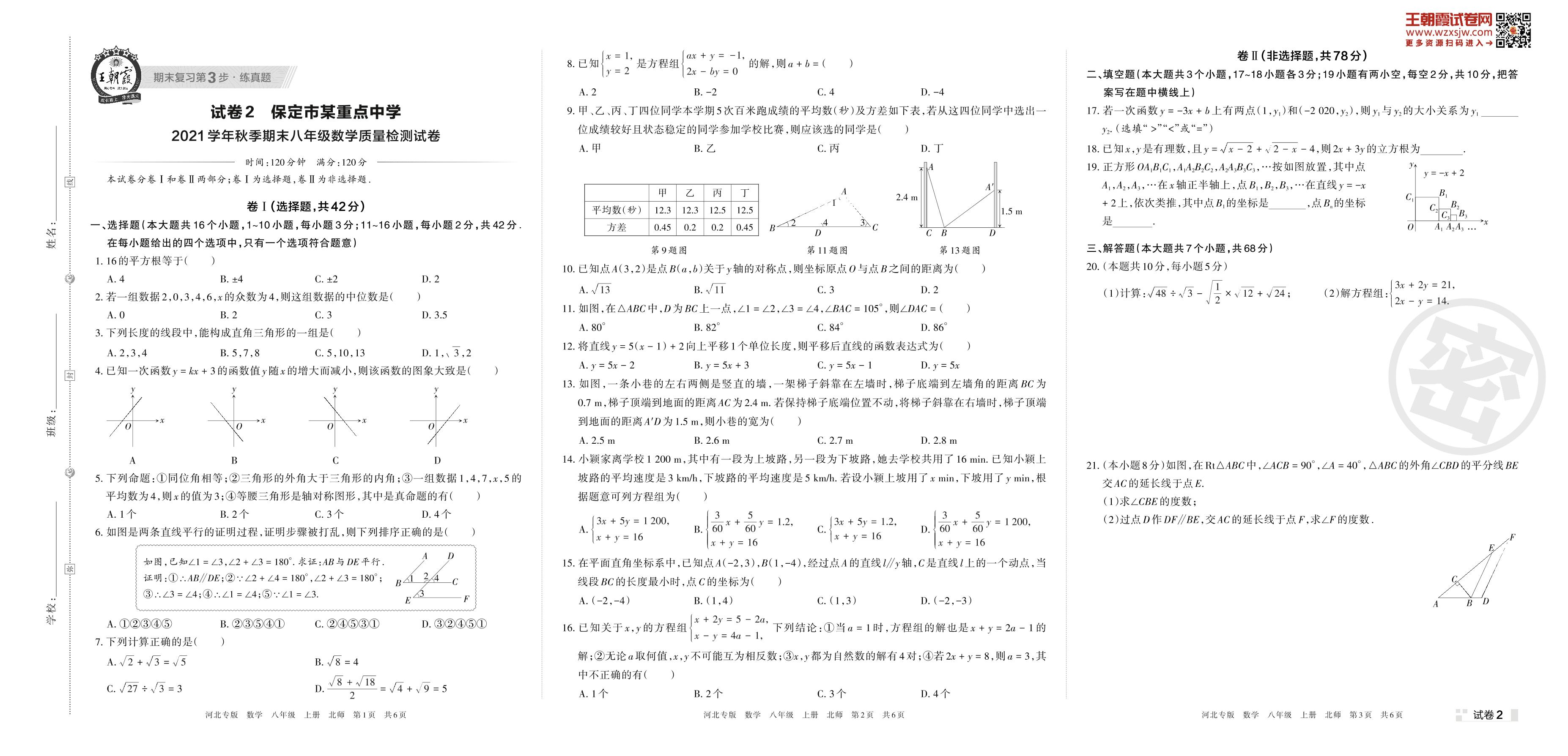 保定市某重点中学2021学年秋季期末八年级数学质量检测试卷(北师版)【2】