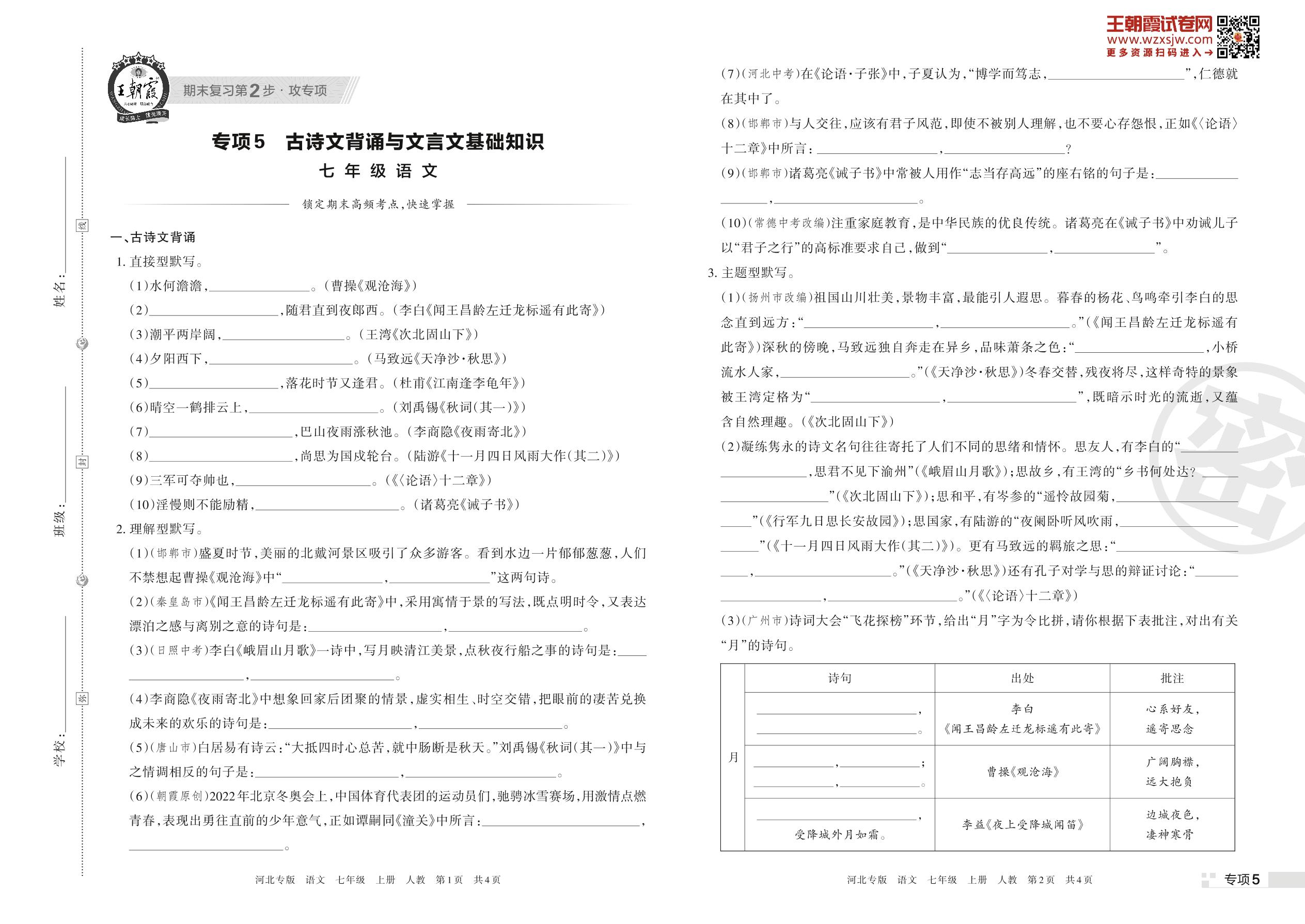 王朝霞期末专项卷——古诗文背诵与文言文基础知识七年级上册语文(人教版)【5】