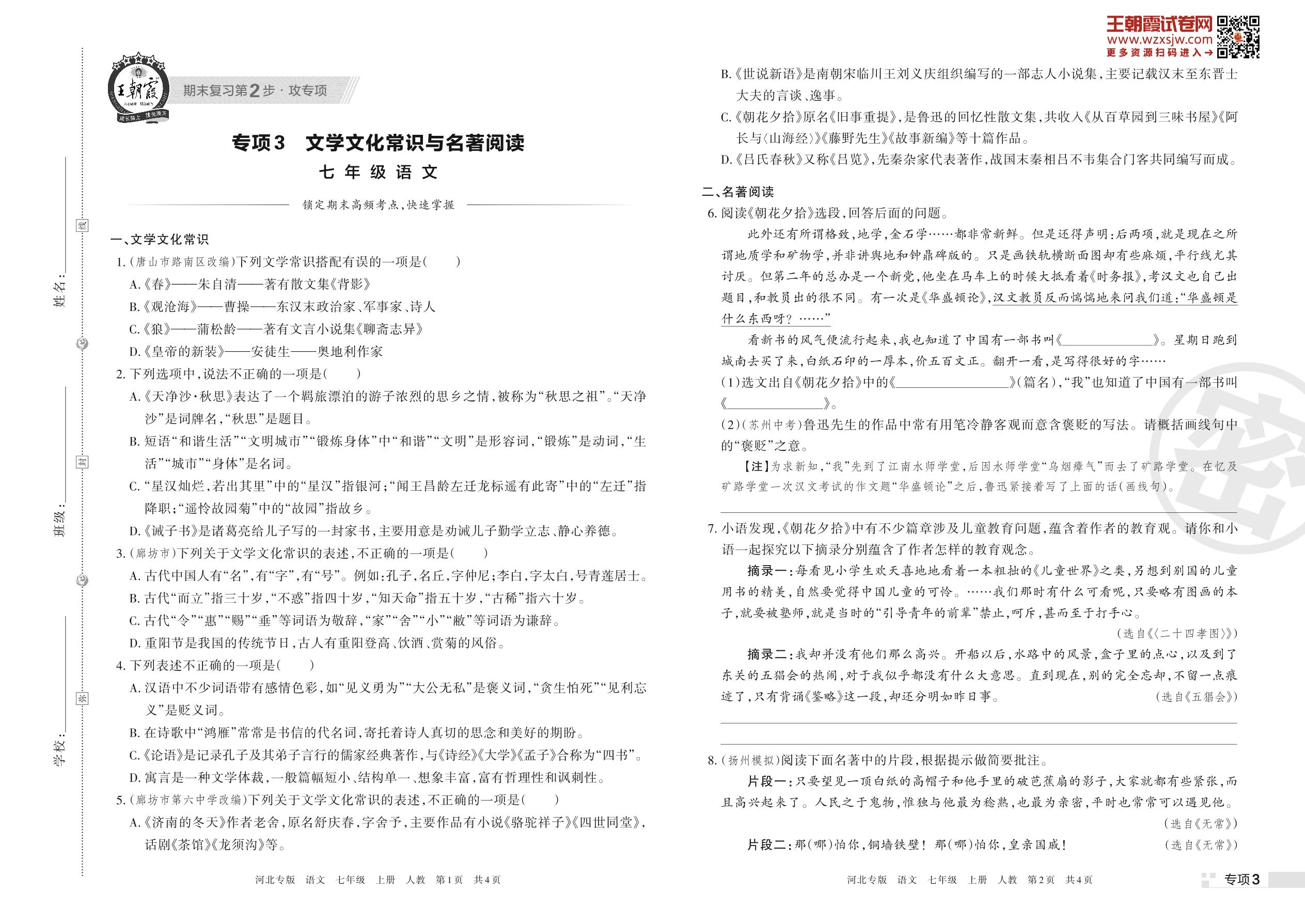 王朝霞期末专项卷——文学文化常识与名著阅读七年级上册语文(人教版)【3】