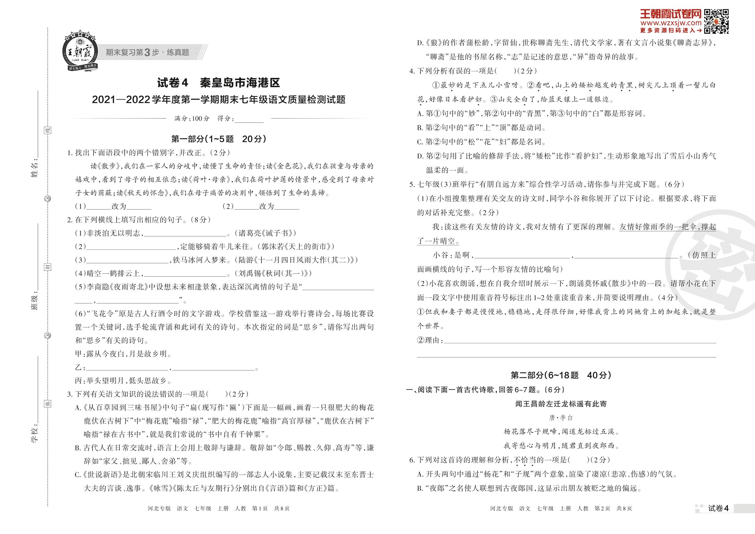 秦皇岛市海港区2021—2022学年度第一学期期末七年级语文质量检测试题(人教版)【4】