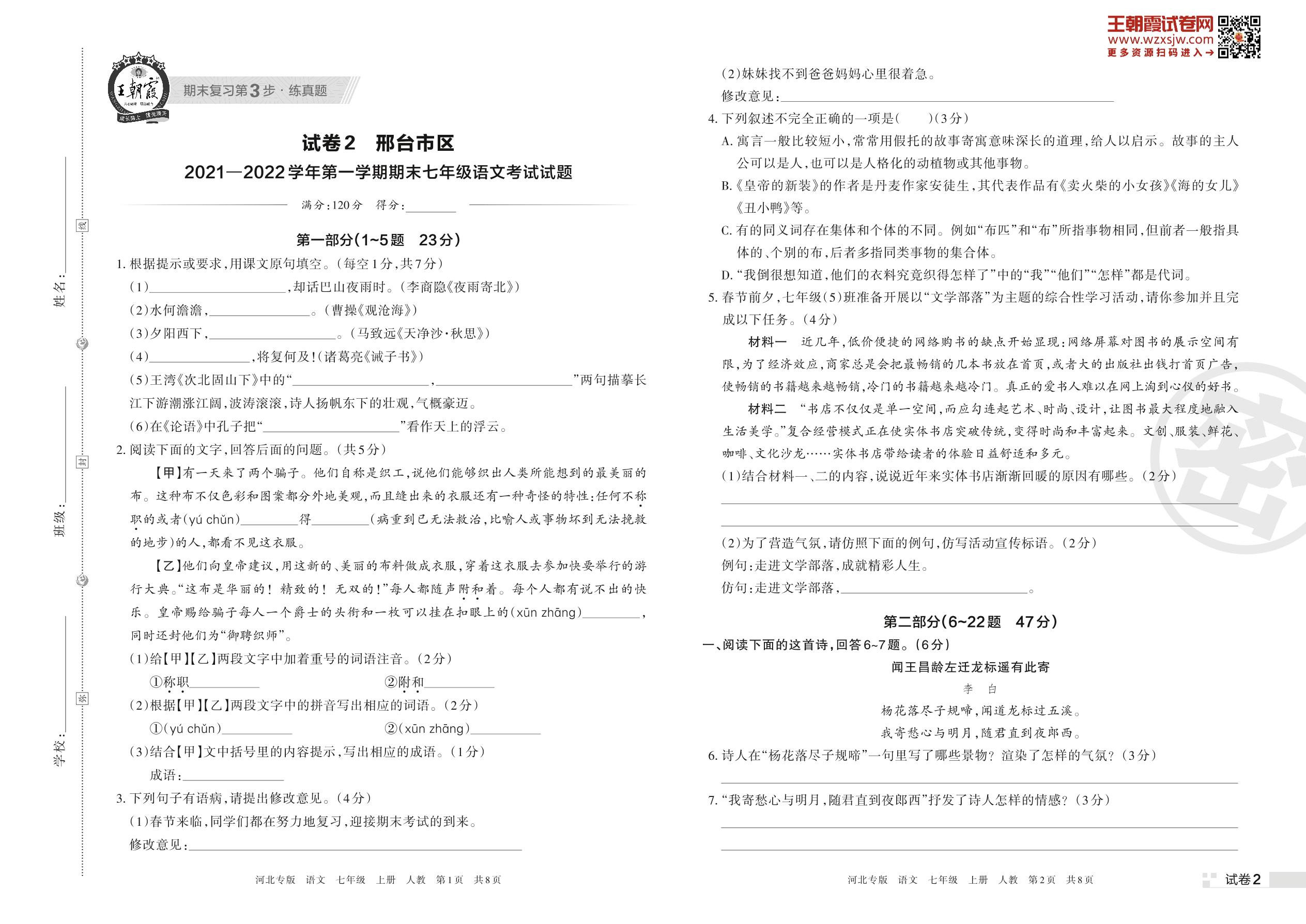 邢台市区2021—2022学年第一学期期末七年级语文考试试题(人教版)【2】