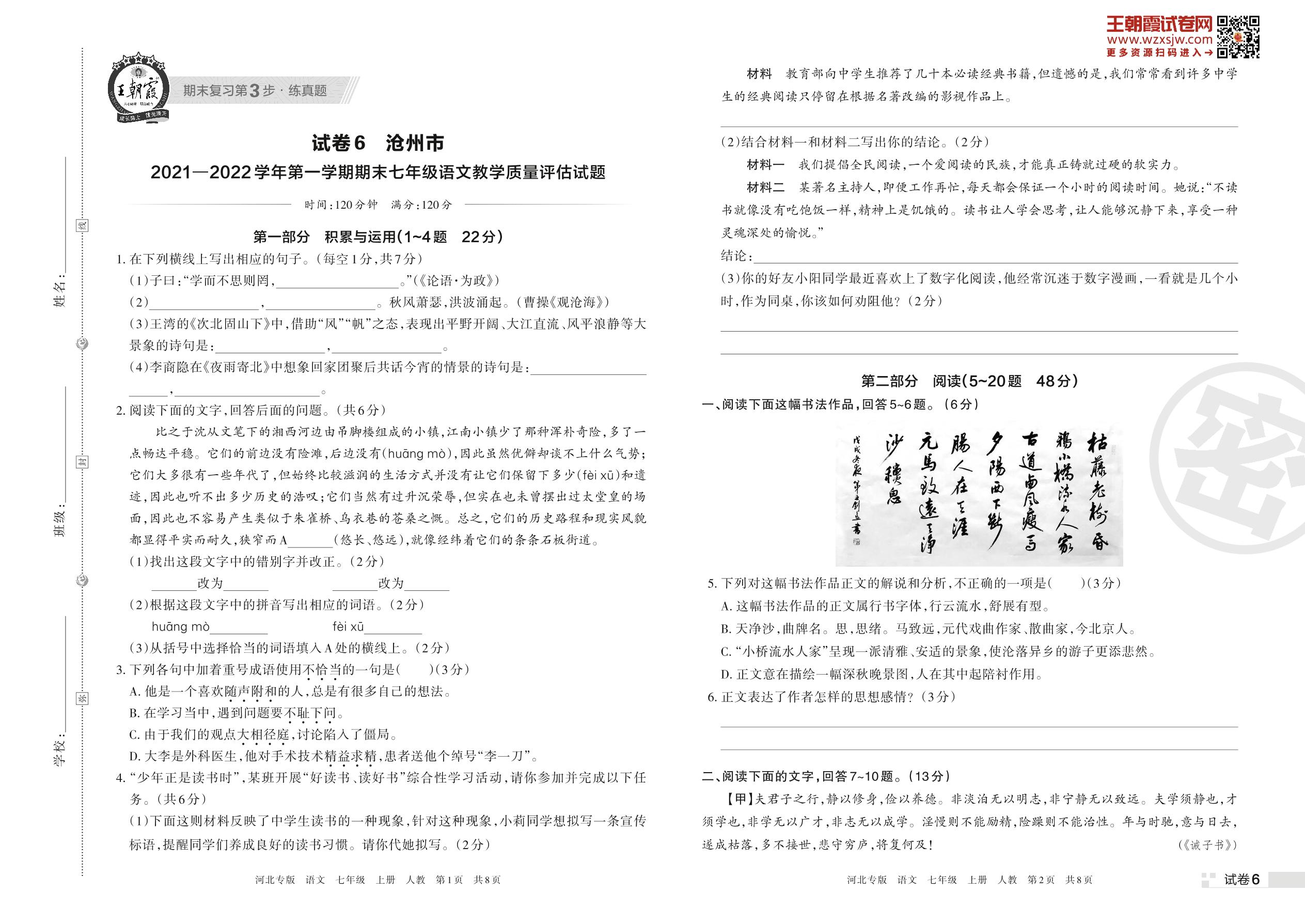 沧州市2021—2022学年第一学期期末七年级语文教学质量评估试题(人教版)【6】
