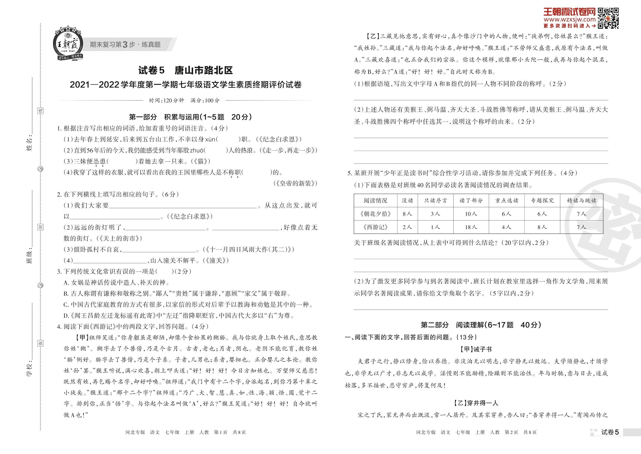 唐山市路北区2021—2022学年度第一学期七年级语文学生素质终期评价试卷(人教版)【5】