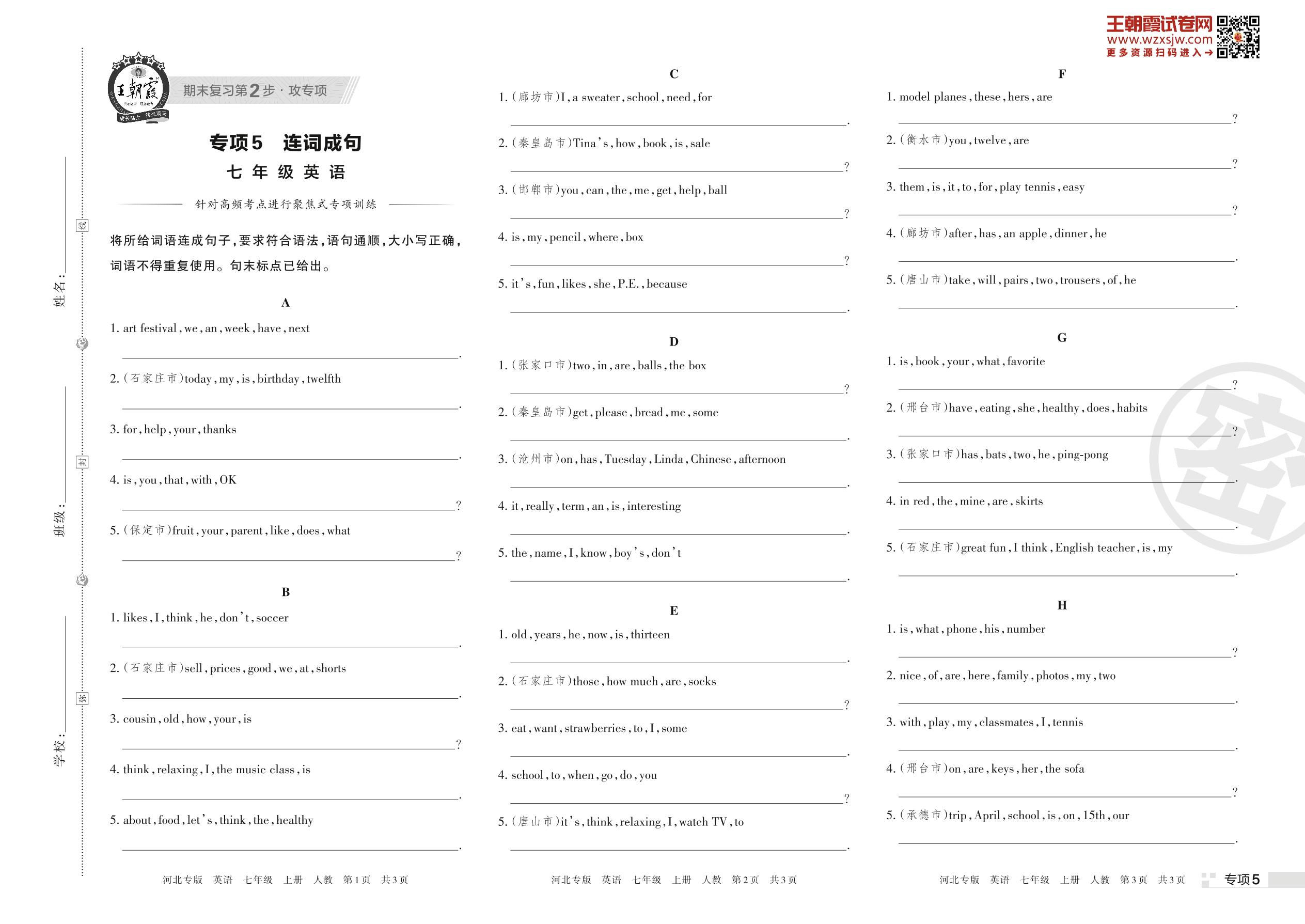 王朝霞期末专项卷——连词成句七年级上册英语(人教版)【5】