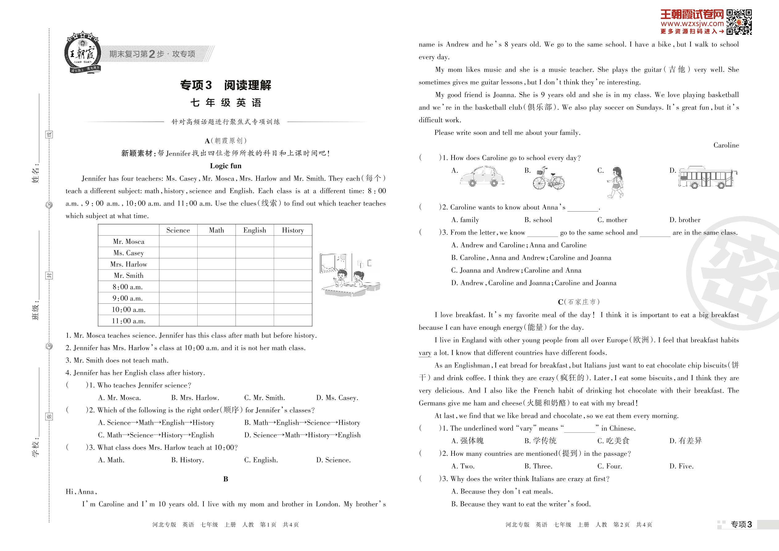 王朝霞期末专项卷——阅读理解七年级上册英语(人教版)【3】