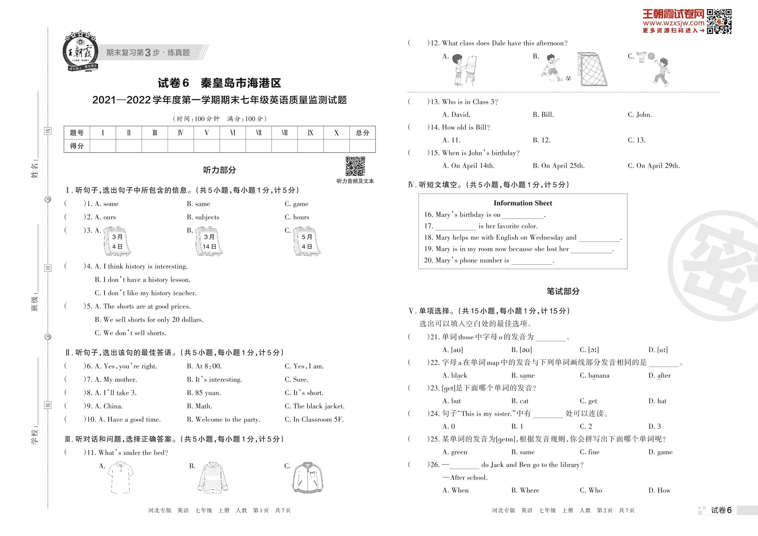 秦皇岛市海港区2021—2022学年度第一学期期末七年级英语质量监测试题(人教版)【6】