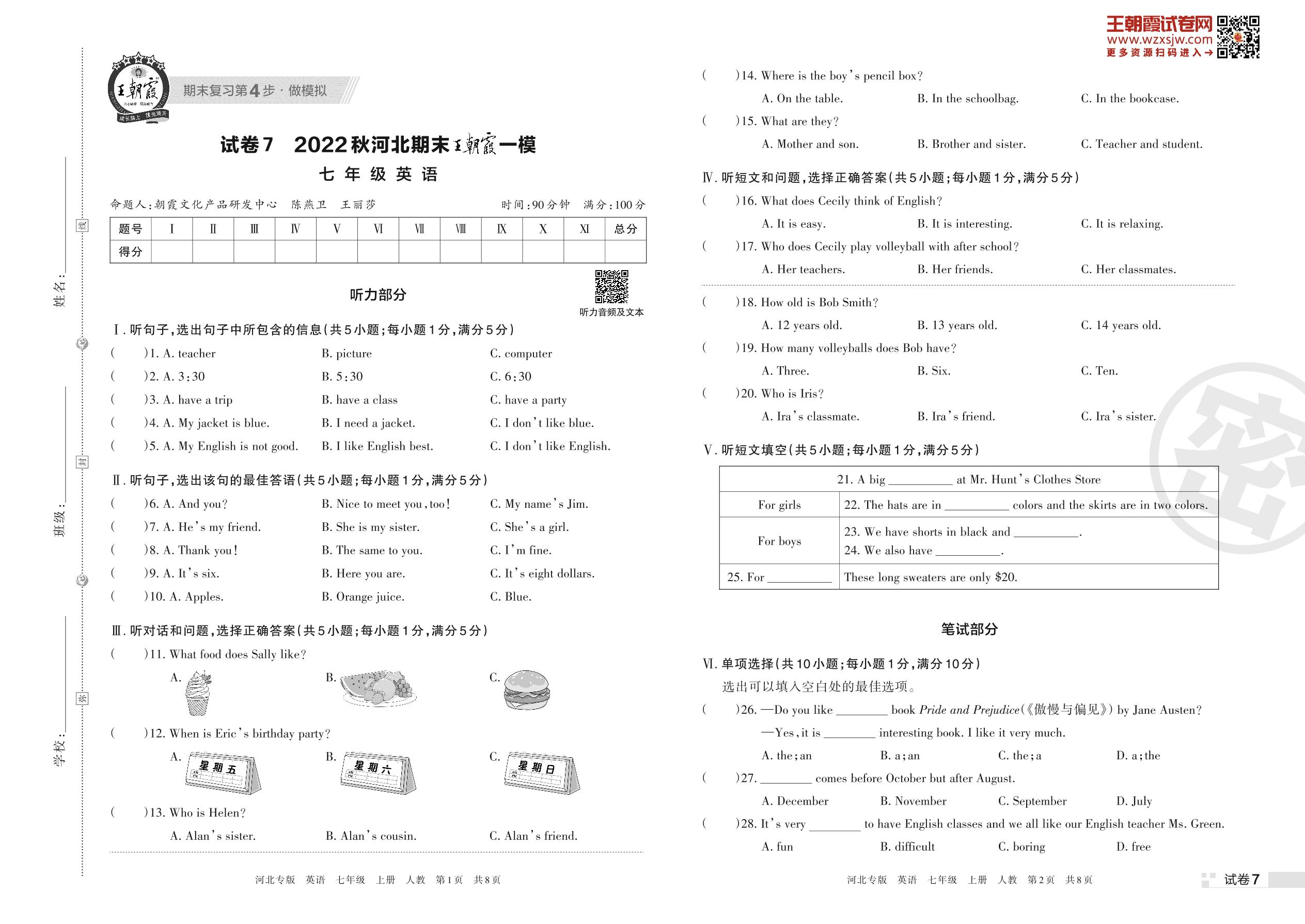 王朝霞期末模拟卷七年级上册英语(人教版)_R221125112302095【7】