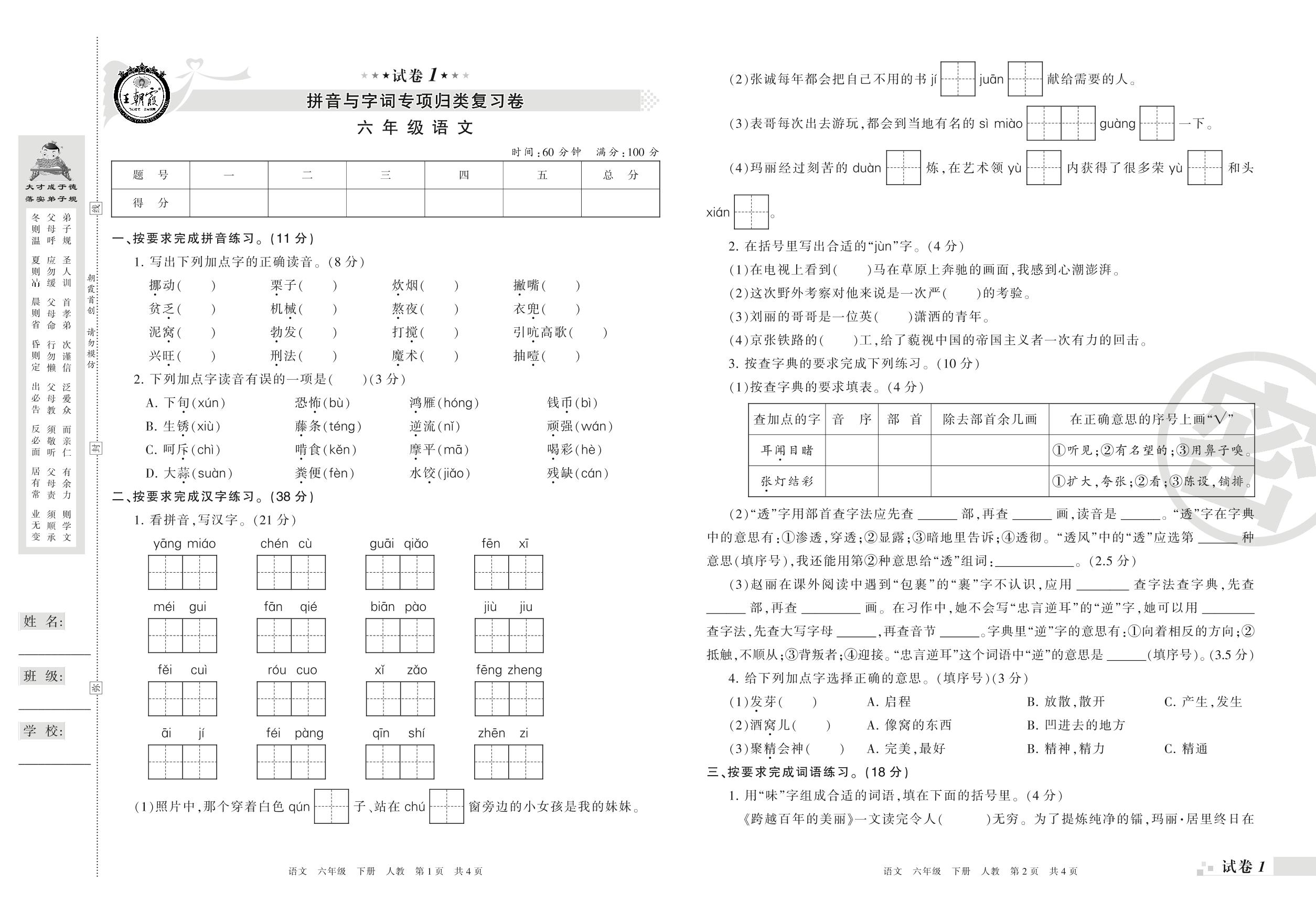王朝霞期末专项卷——拼音与字词专项归类复习卷六年级下册语文(人教版)_R210802120540【1】
