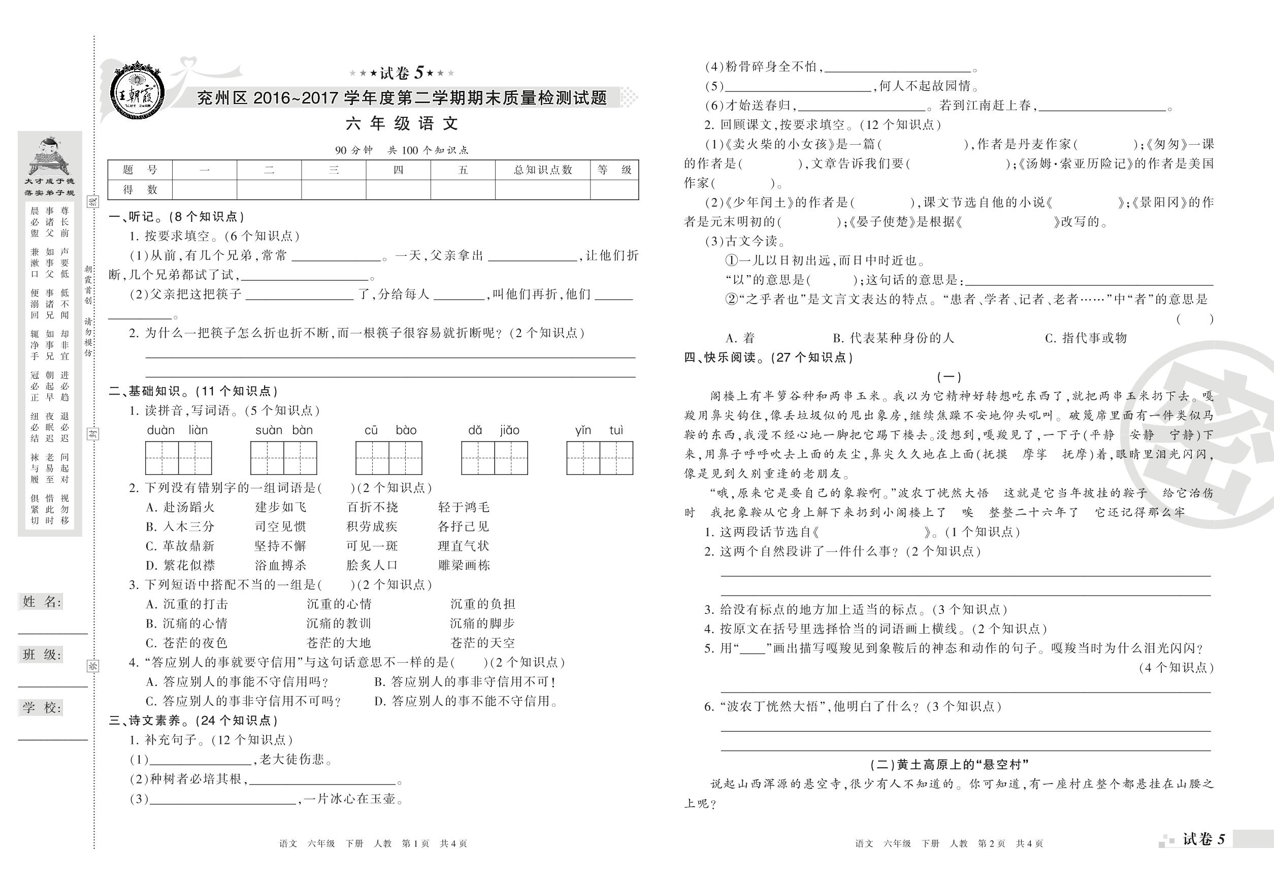 2016-2017学年第二学期济宁市兖州区六年级语文试卷(人教版)【5】