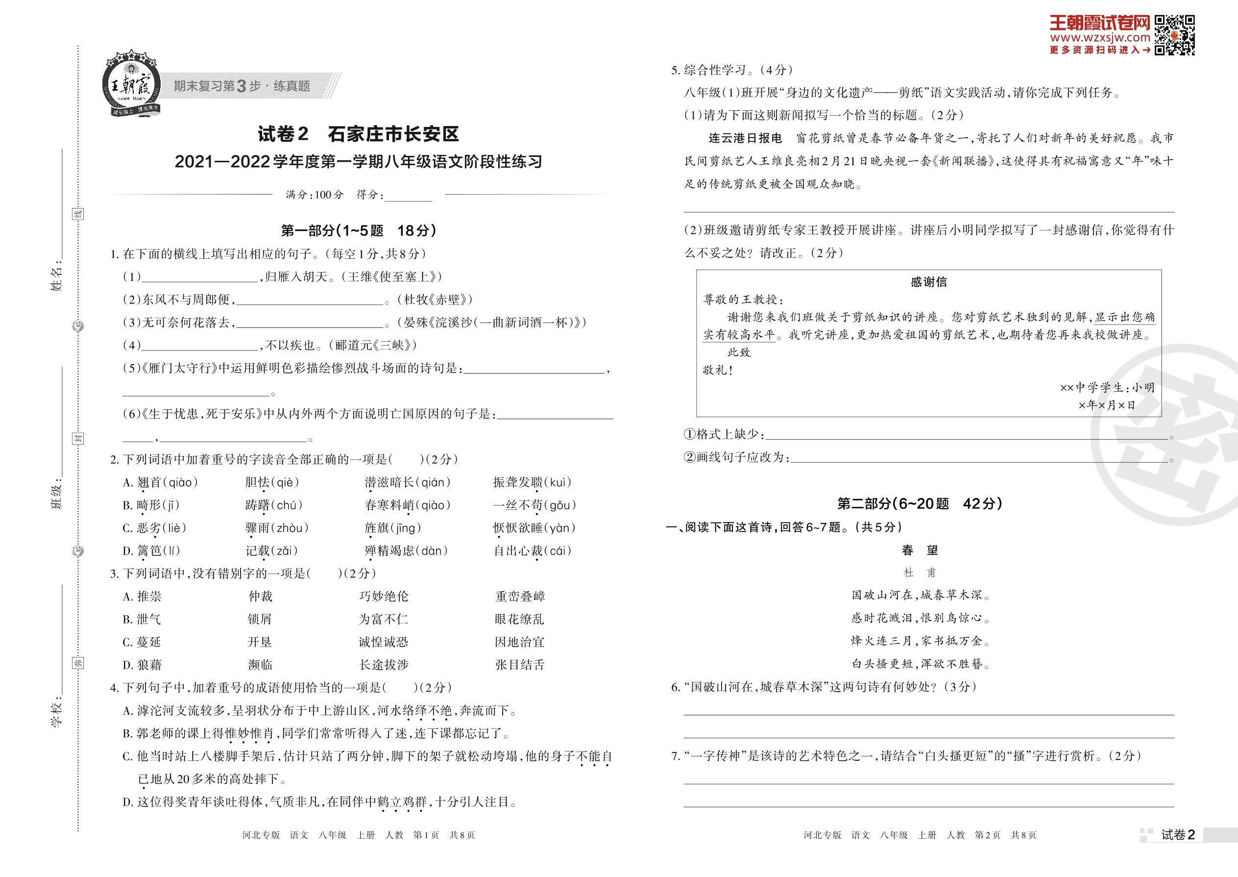 石家庄市长安区2021—2022学年度第一学期八年级语文阶段性练习(人教版)【2】