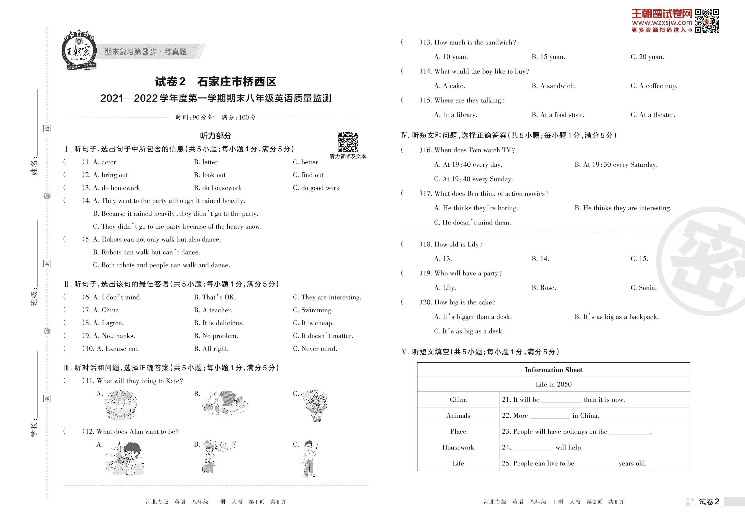 石家庄市桥西区2021—2022学年度第一学期期末八年级英语质量监测(人教版)【2】