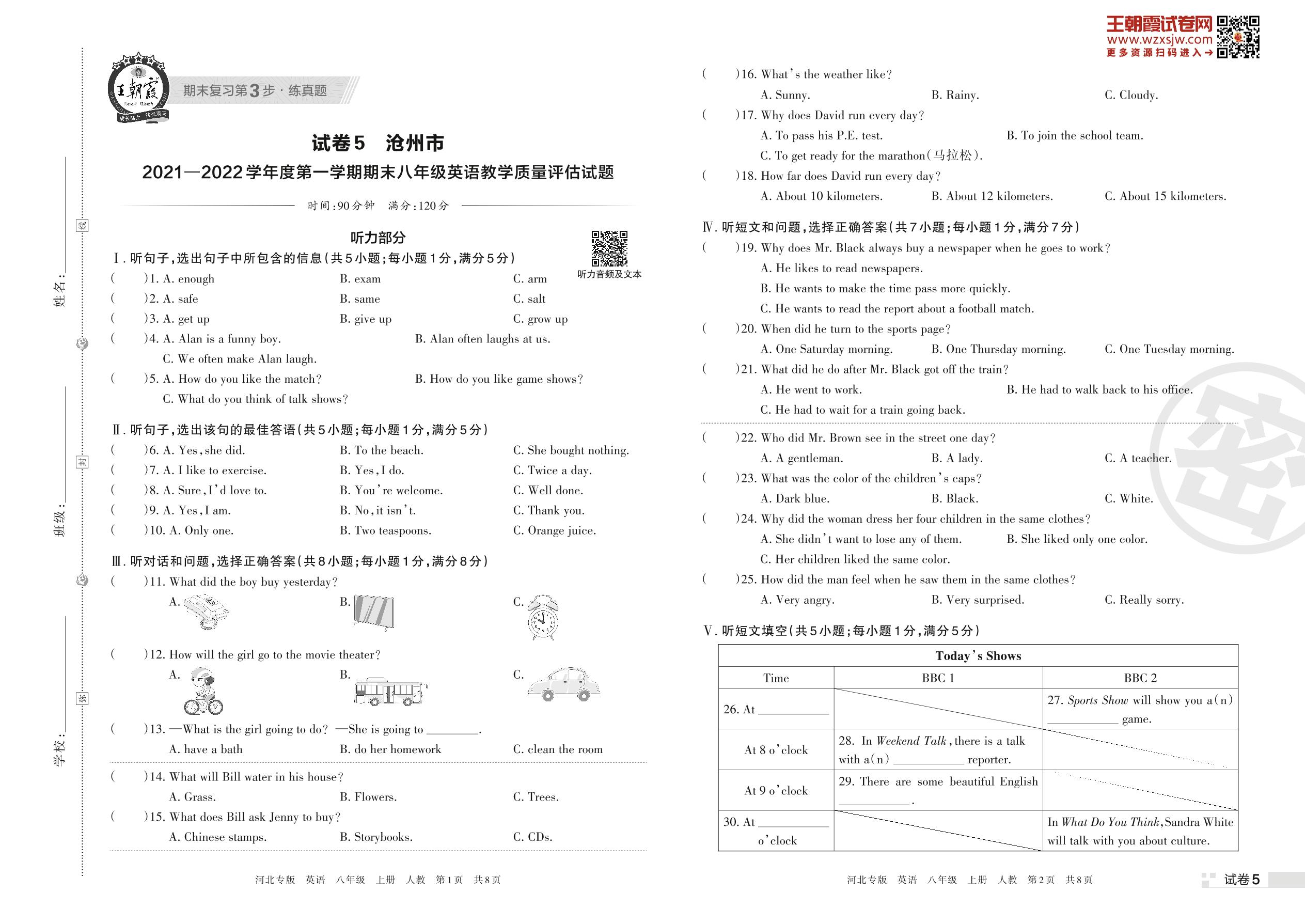 沧州市2021—2022学年度第一学期期末八年级英语教学质量评估试题(人教版)【5】