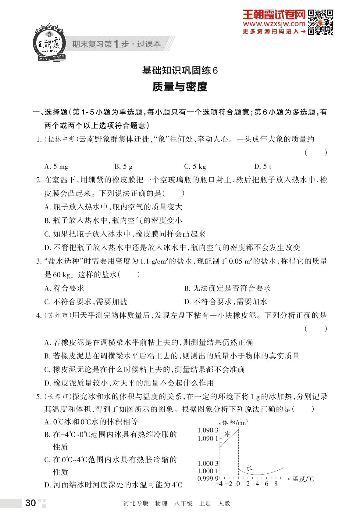 王朝霞期末过课本——基础知识巩固练6 质量与密度八年级上册物理(人教版)