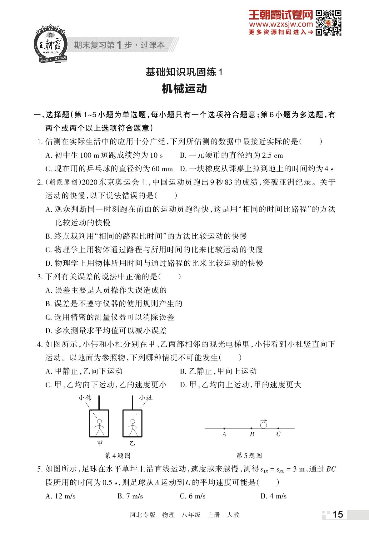 王朝霞期末过课本——基础知识巩固练1 机械运动八年级上册物理(人教版)