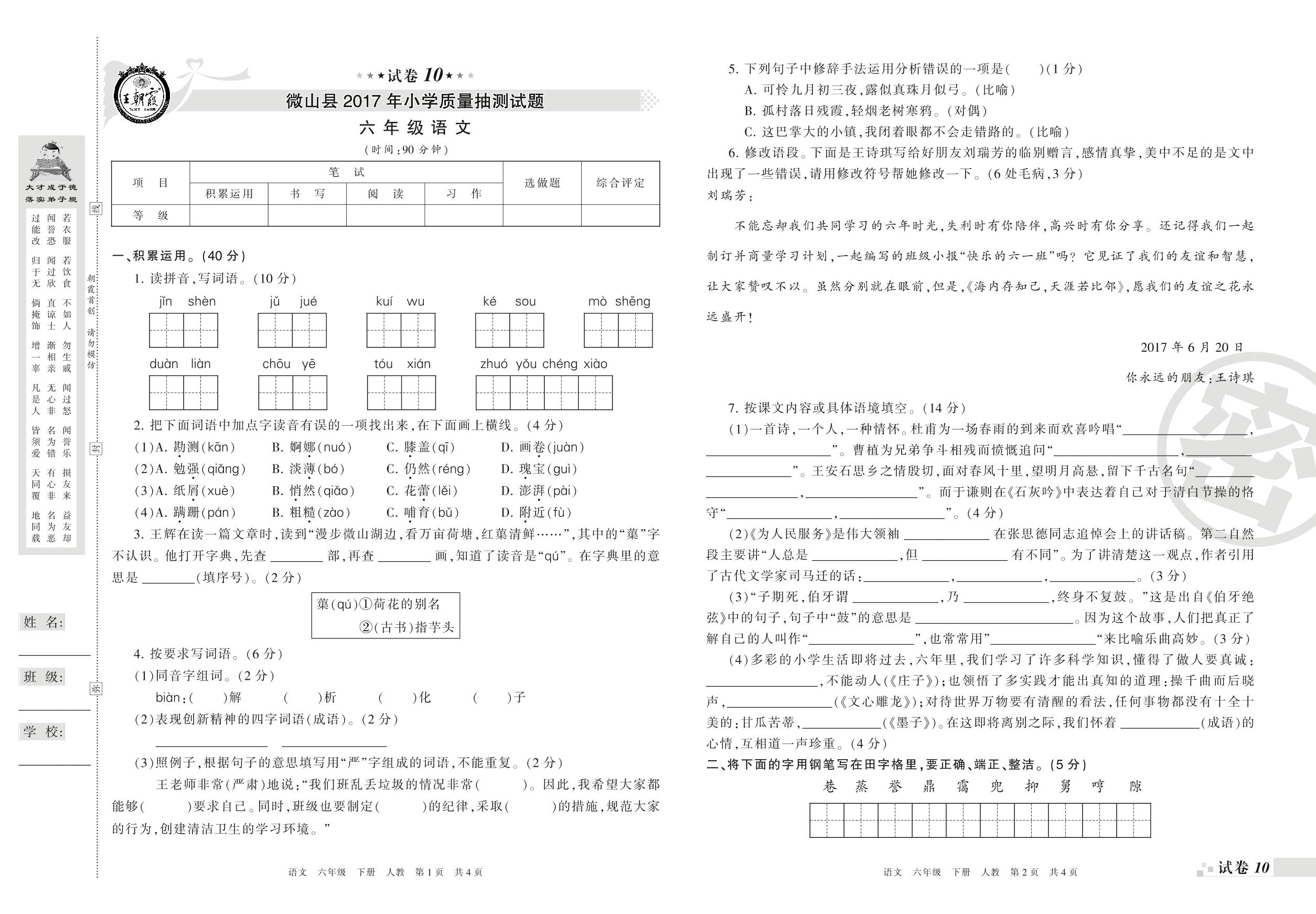 2016-2017学年第二学期济宁市微山县六年级语文试卷(人教版)【10】