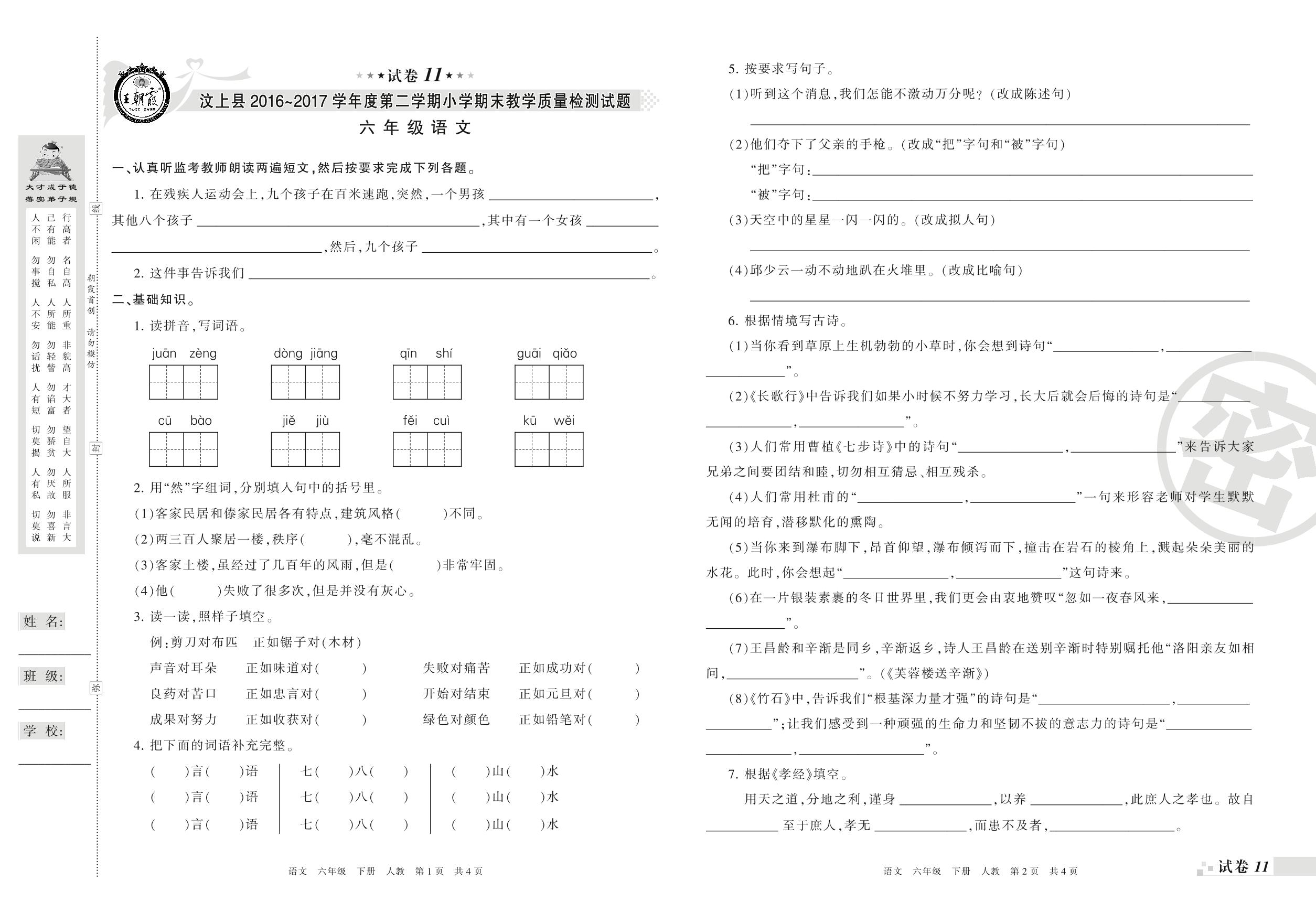 2016-2017学年第二学期济宁市汶上县六年级语文试卷(人教版)【11】