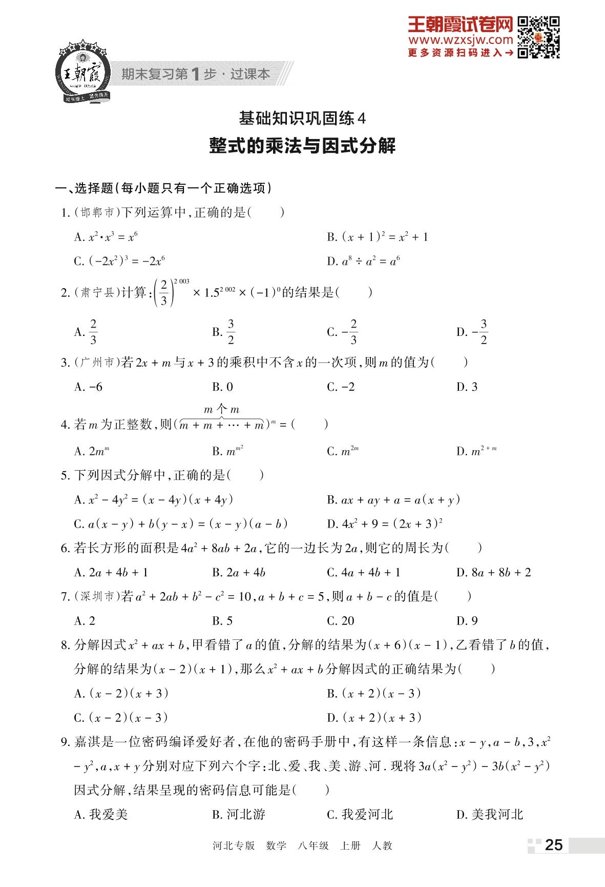 王朝霞期末过课本——基础知识巩固练4 整式的乘法与因式分解八年级上册数学(人教版)