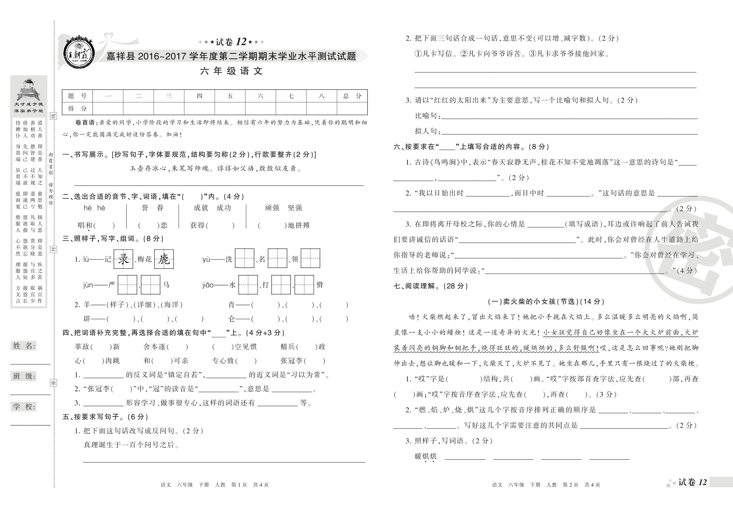 2016-2017学年第二学期济宁市嘉祥县六年级语文试卷(人教版)【12】