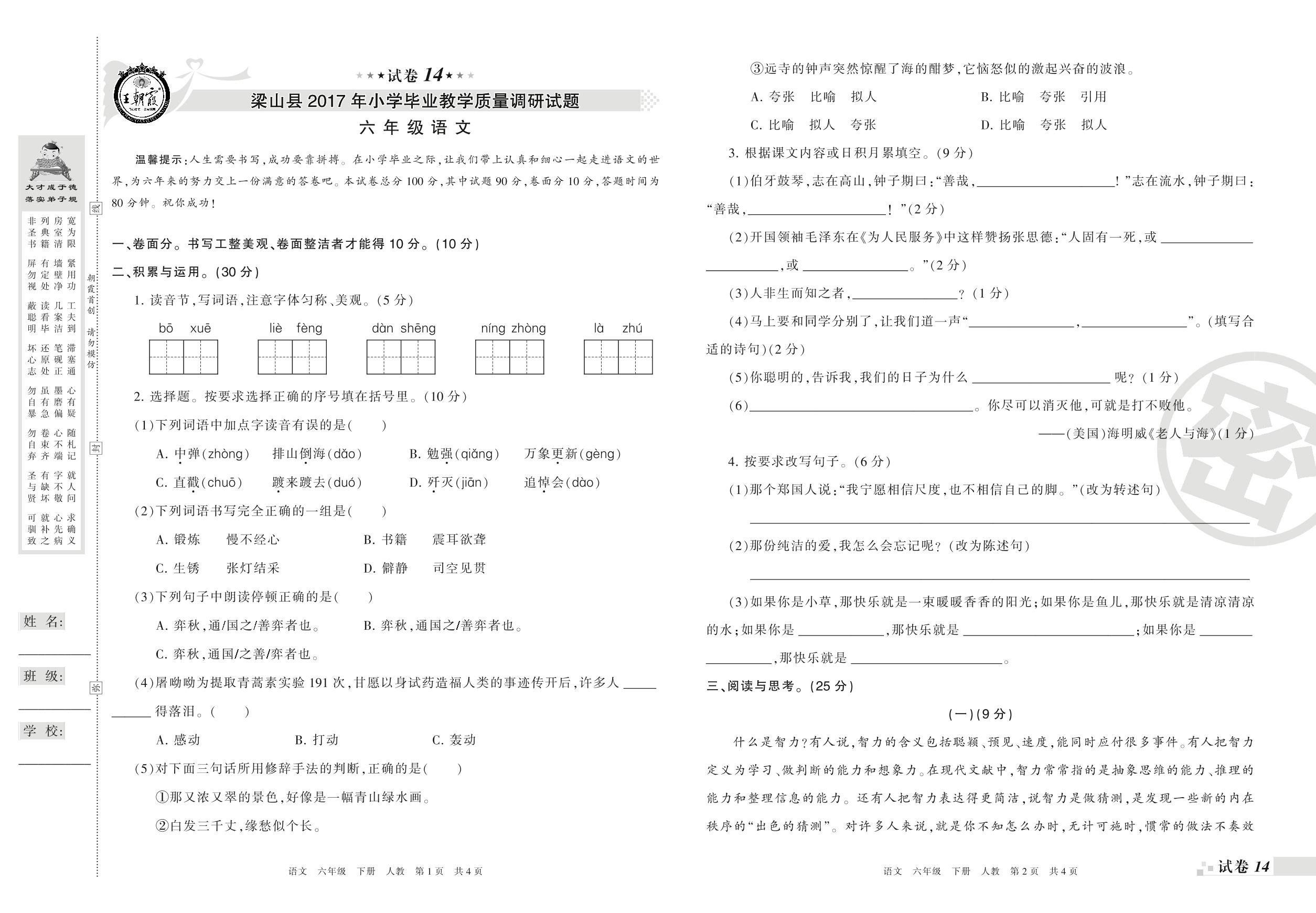 2016-2017学年第二学期济宁市梁山县六年级语文试卷(人教版)【14】